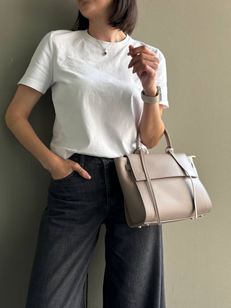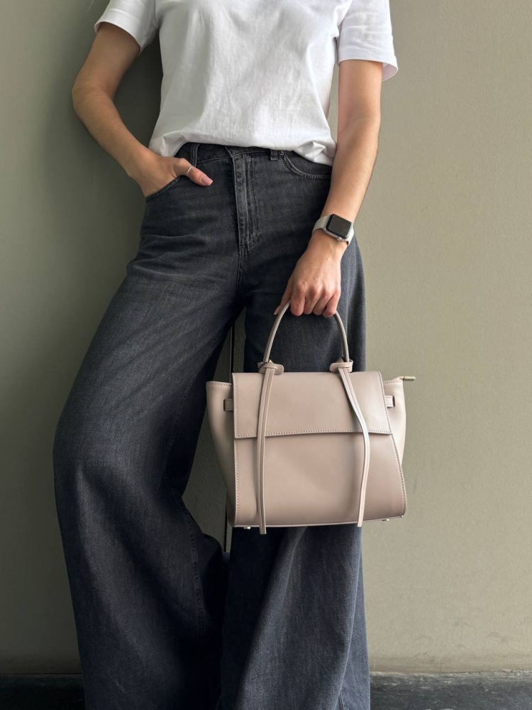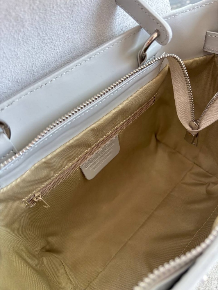 Fabric lining inside. One compartment + small inner pocket with zipper.