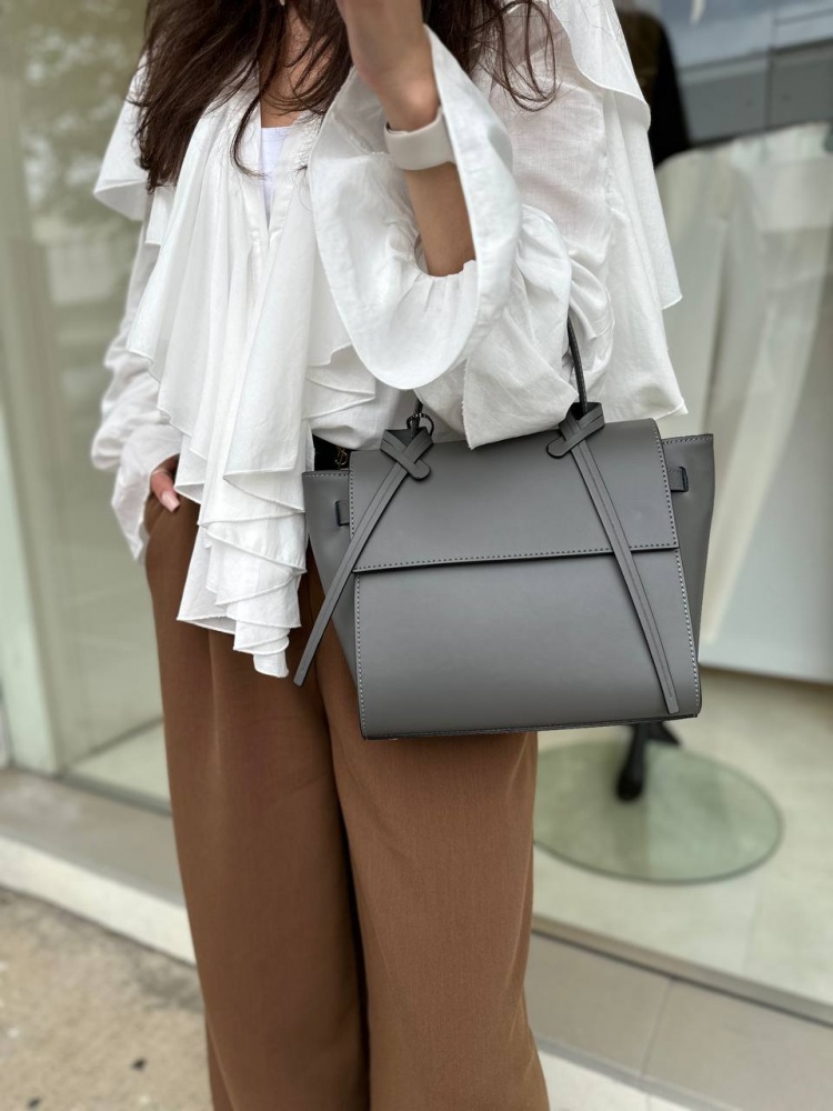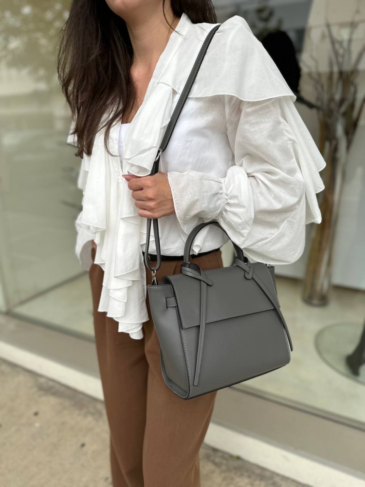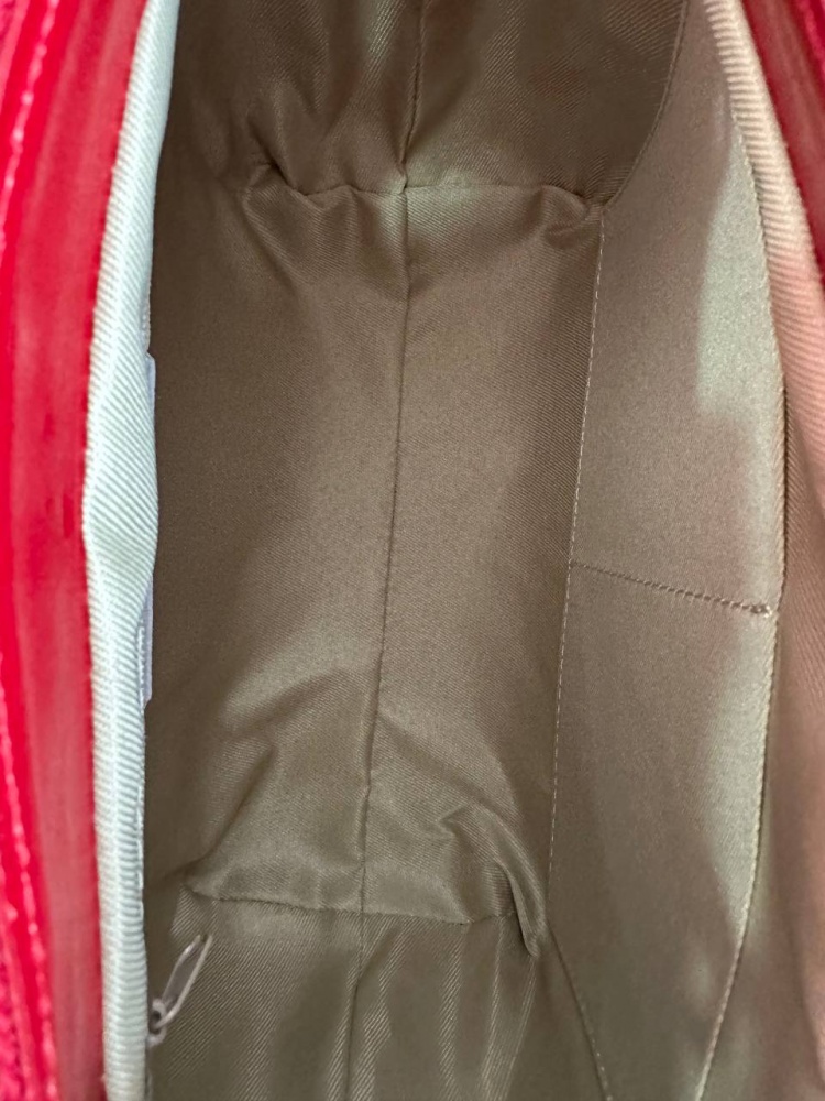Fabric lining inside. One compartment + small inner pocket with zipper.