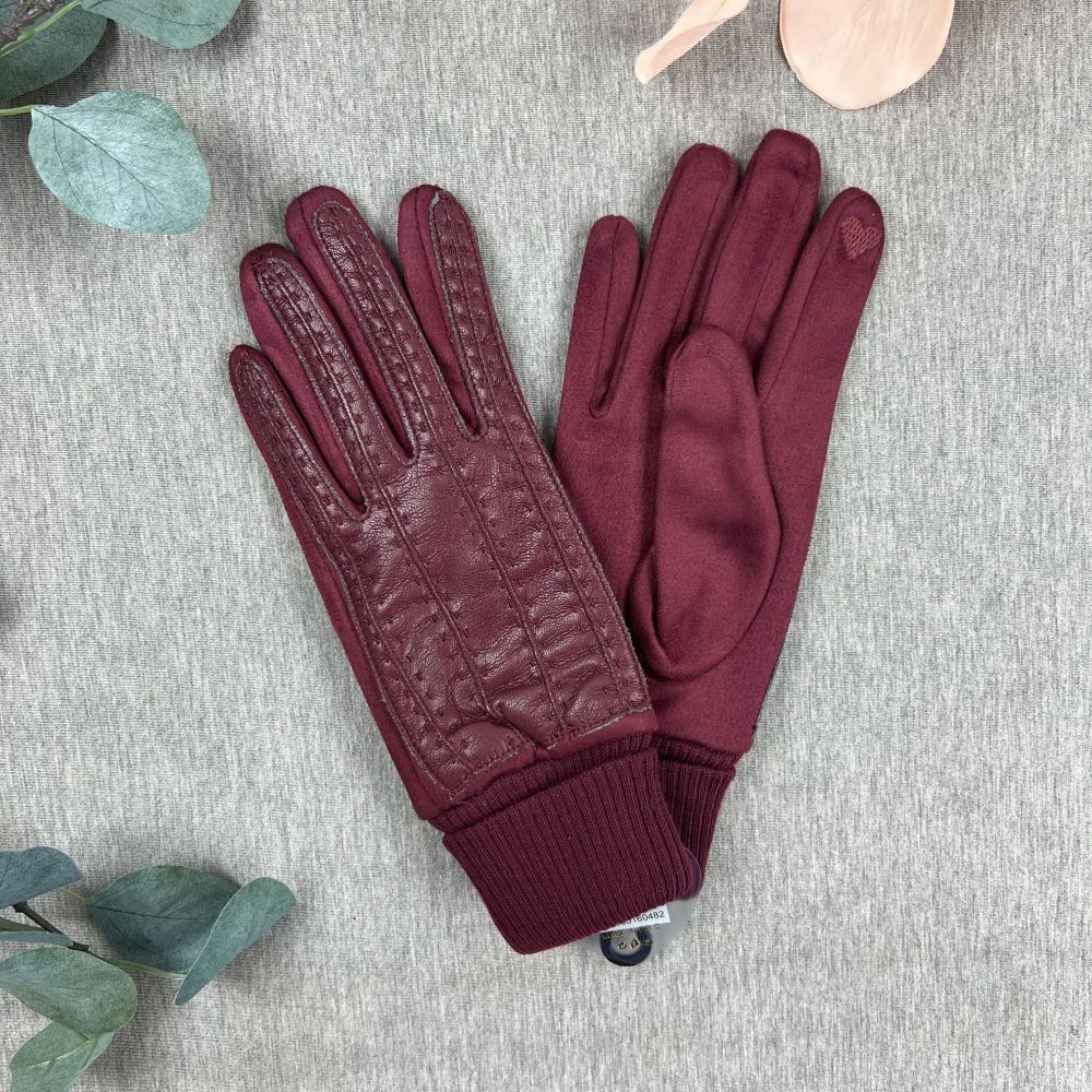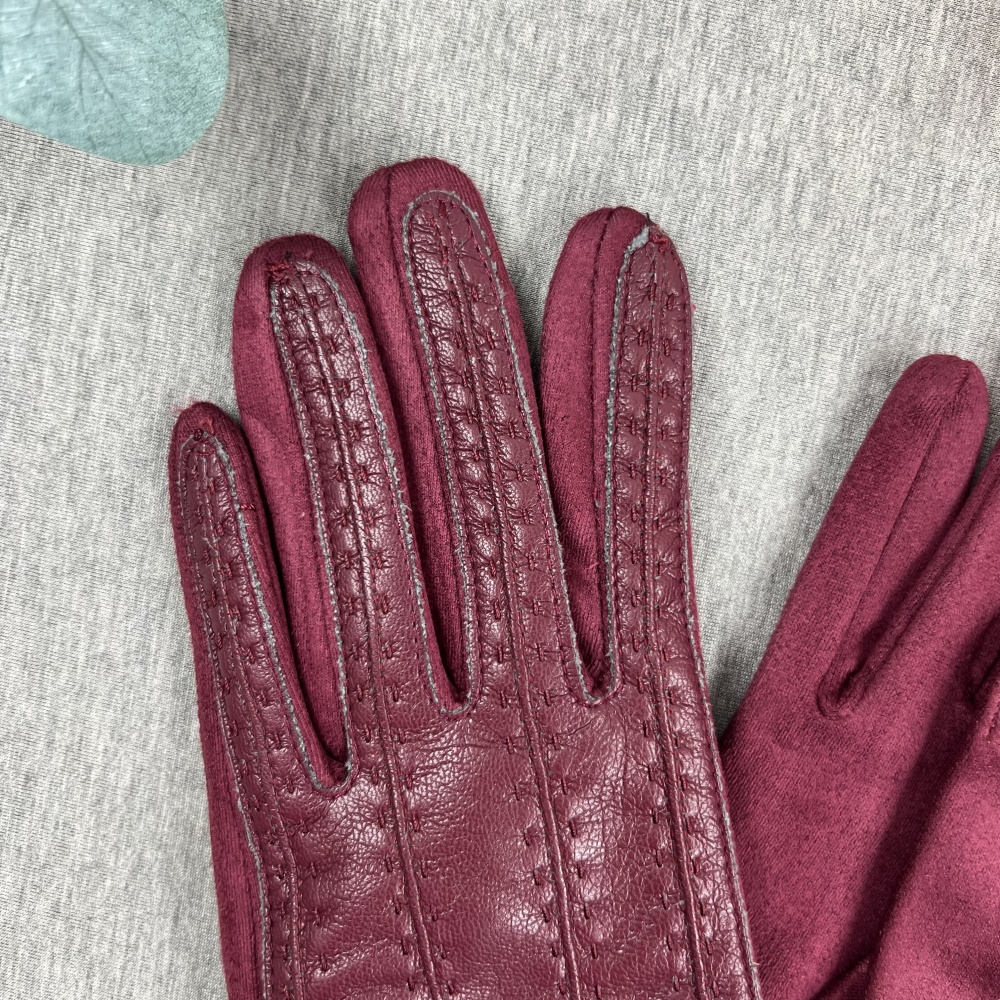 Smooth leather on the top, suede on the palm. Acrylic knit inside.