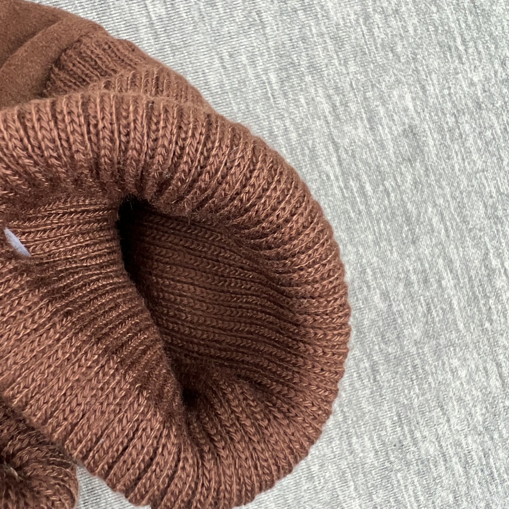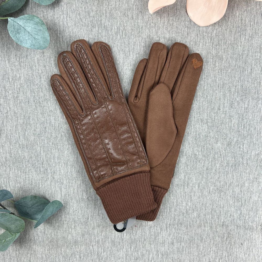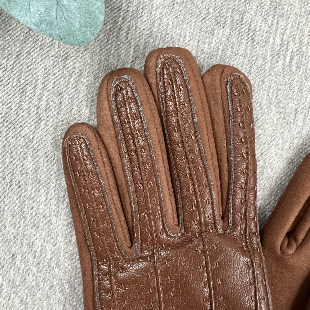 Smooth leather on the top, suede on the palm. Acrylic knit inside.