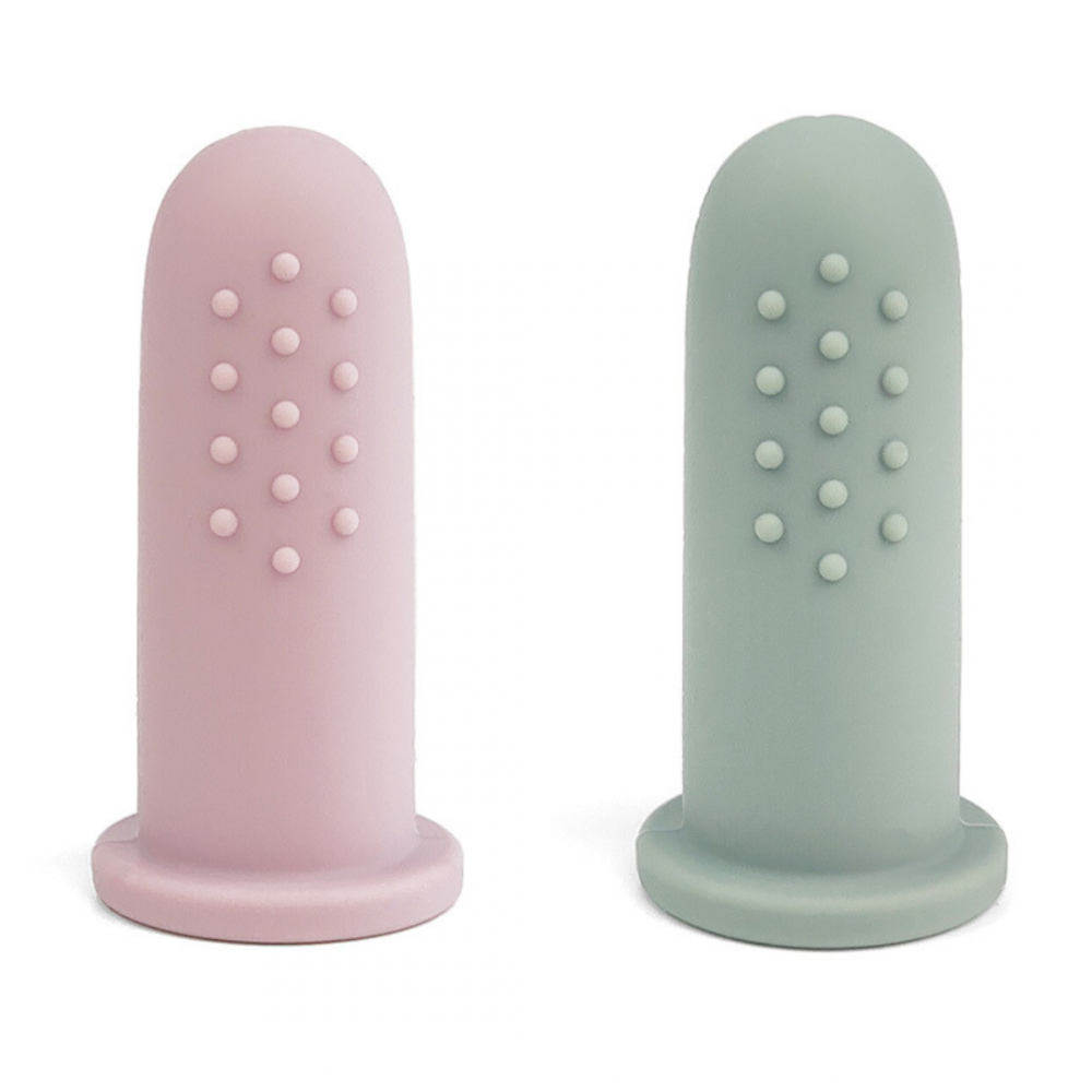 The silicone toothbrush for babies can be used for brushing teeth, use the side with longer bristles and massage the gums when teething, use the side with bumps for this.