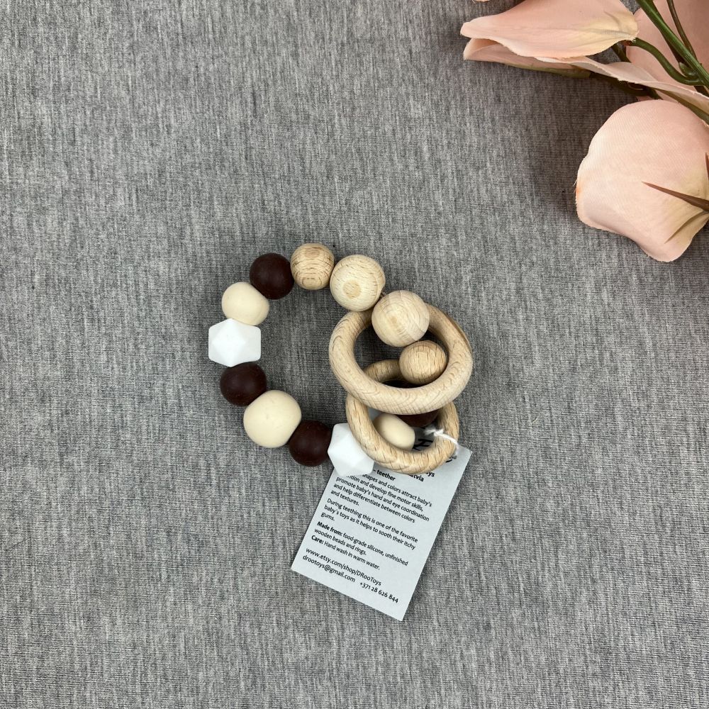 Silicone/wooden baby rattle-teether "Brown/Beige/White"