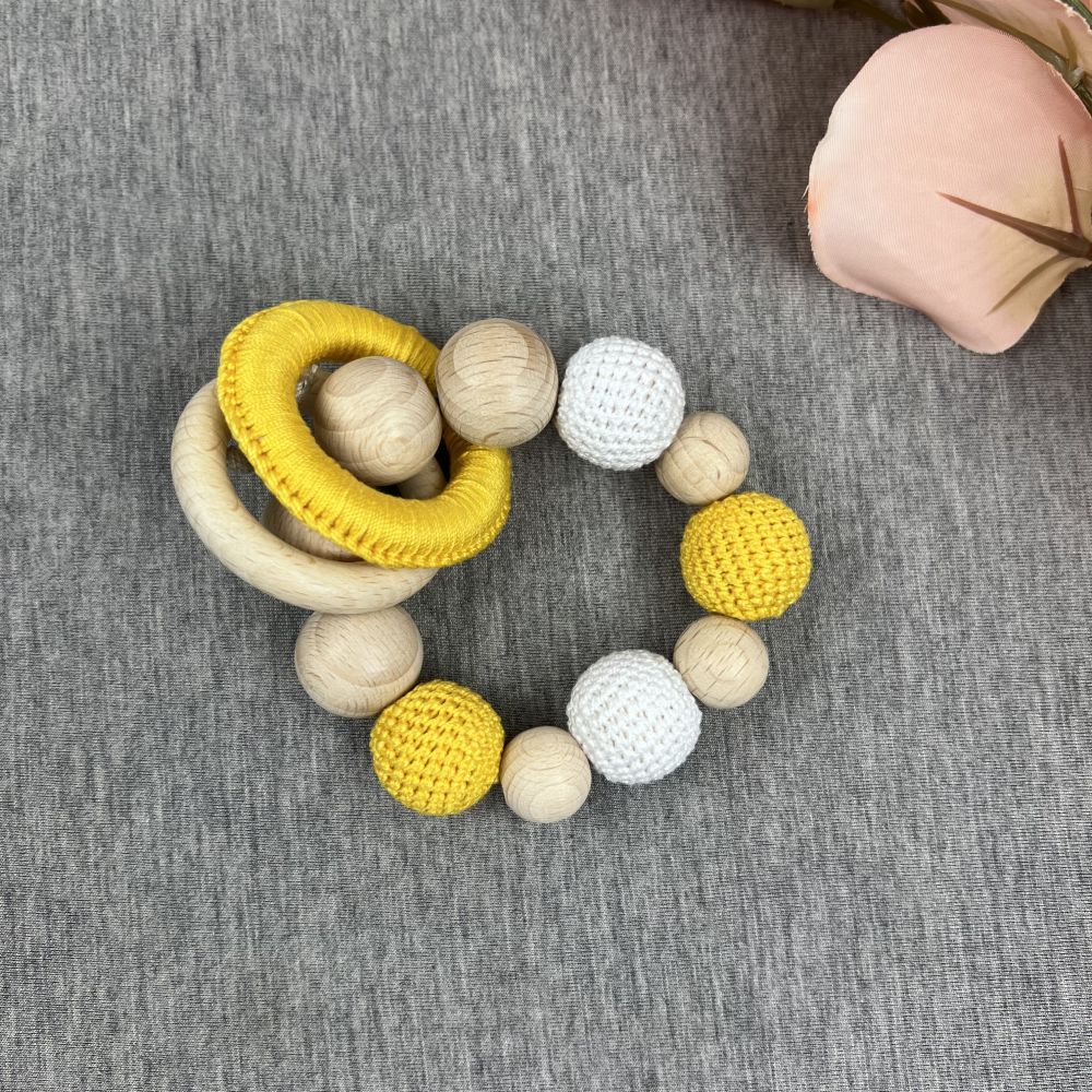 Silicone/wooden baby rattle-teether "Yellow/White/Beige"