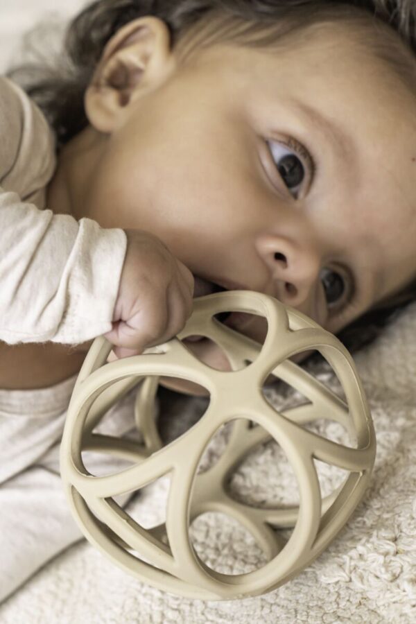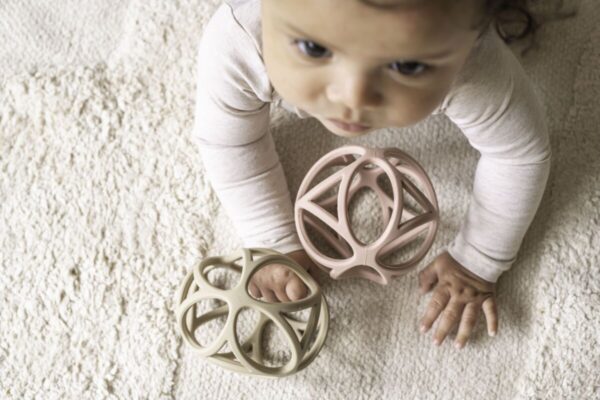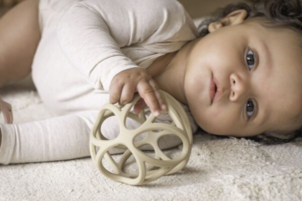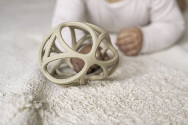 A soft sensory play ball. This sensory ball is both soft and flexible. While playing, the ball stimulates your baby's senses by feeling, squeezing, sucking and rolling the ball.