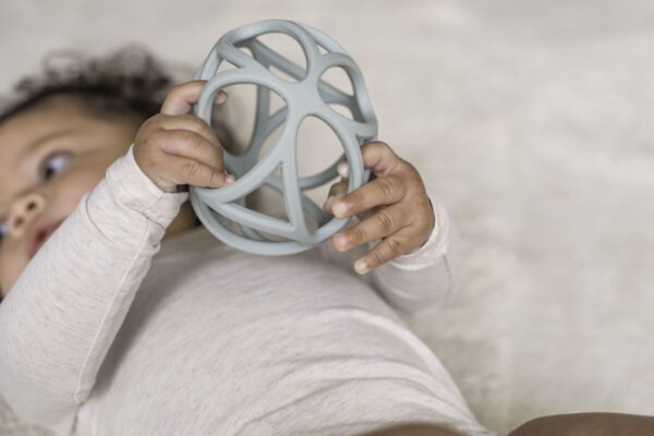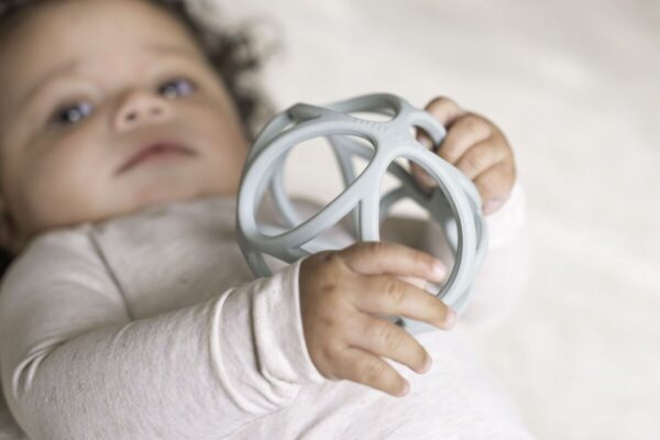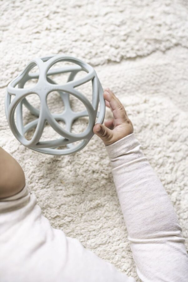 A soft sensory play ball. This sensory ball is both soft and flexible. While playing, the ball stimulates your baby's senses by feeling, squeezing, sucking and rolling the ball.