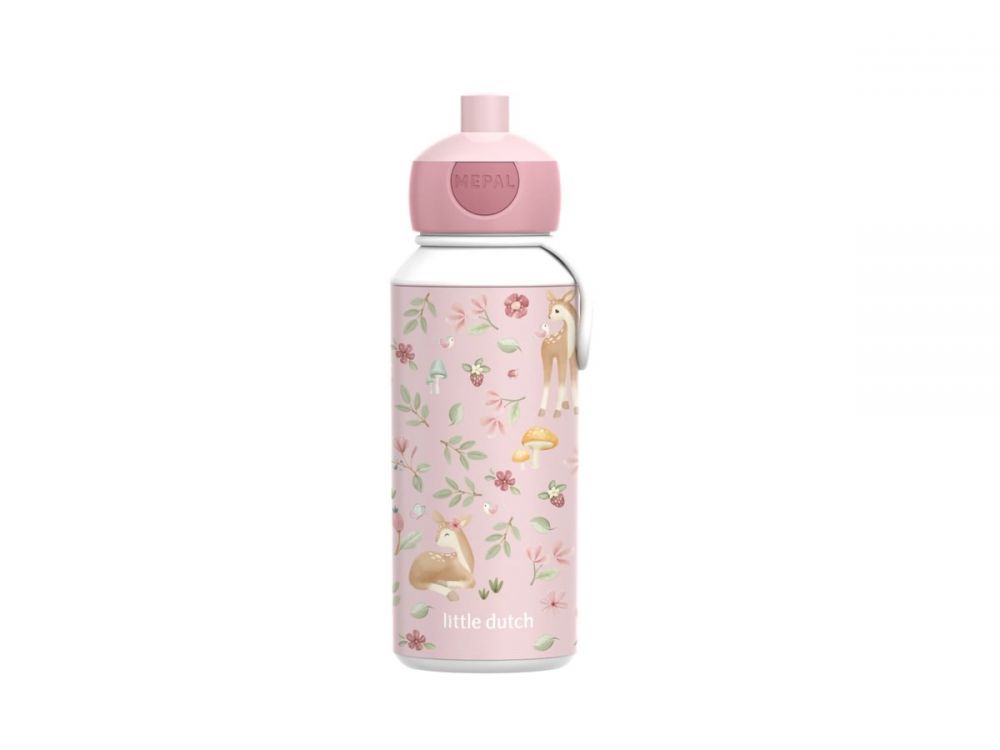 Just press and drink. With this beautiful Little Dutch pop-up drinking bottle, it's very easy, just press and take a sip. Press again and it closes. The pop-up drinking bottle is ideal for little explorers who meet the world full of energy. Thanks to the clever design, children can open and close the bottle with one hand. This leaves more time for playing, exploring and enjoying. The leak-proof cap prevents accidents in the school bag and the carrying loop makes the bottle extra easy to take with you. Leak-proof and handy for active moments or just for a drink break. Children can easily use the bottle without the help of their parents. After an adventurous day, the bottle can simply be put in the dishwasher. This drinking bottle is easy to clean and stylishly matches the Little Dutch lunch box and backpack.