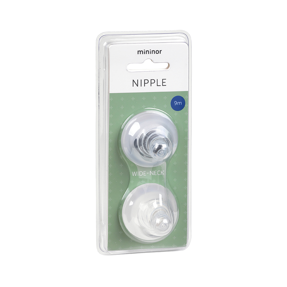 Mininor nipples are available in 5 sizes that fit all Mininor bottles: 0m, 3m, 6m, 9m and 9m+. These age-indications should be taken as a guide as babies with the same age might have different needs and capabilities. As a rule of thumb, if the baby can finish a meal in less than 10 minutes the hole is too big, and if the baby takes longer than 15 minutes to finish a meal the hole is too small.