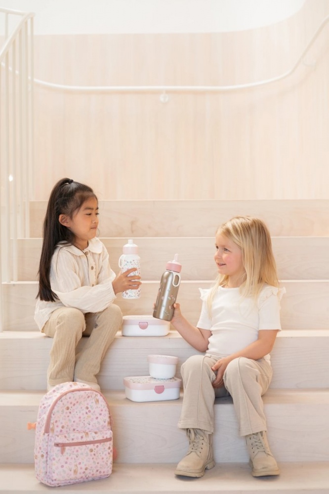 Just press and drink. With this beautiful Little Dutch pop-up drinking bottle, it's very easy, just press and take a sip. Press again and it closes. The pop-up drinking bottle is ideal for little explorers who meet the world full of energy. Thanks to the clever design, children can open and close the bottle with one hand. This leaves more time for playing, exploring and enjoying. The leak-proof cap prevents accidents in the school bag and the carrying loop makes the bottle extra easy to take with you. Leak-proof and handy for active moments or just for a drink break. Children can easily use the bottle without the help of their parents. After an adventurous day, the bottle can simply be put in the dishwasher. This drinking bottle is easy to clean and stylishly matches the Little Dutch lunch box and backpack.
