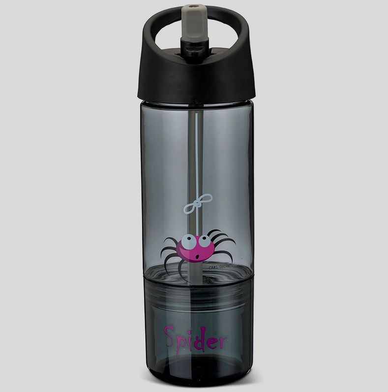 Bottle with a removable bottom cup which has space for fruit, biscuits or nuts. Comes in five lovely colours with cool animal motifs and makes it possible for children on the go to drink without spills and leaks, and with a smile too. The cap with an integrated carrying handle has a fold-out spout that is easy to drink from. The bottle holds 0.3 l and the bottom cup 0.15 l. It is made of BPA- and phthalate-free Tritan™ and PP-plastic. Top-rack dishwasher-safe.