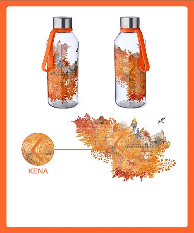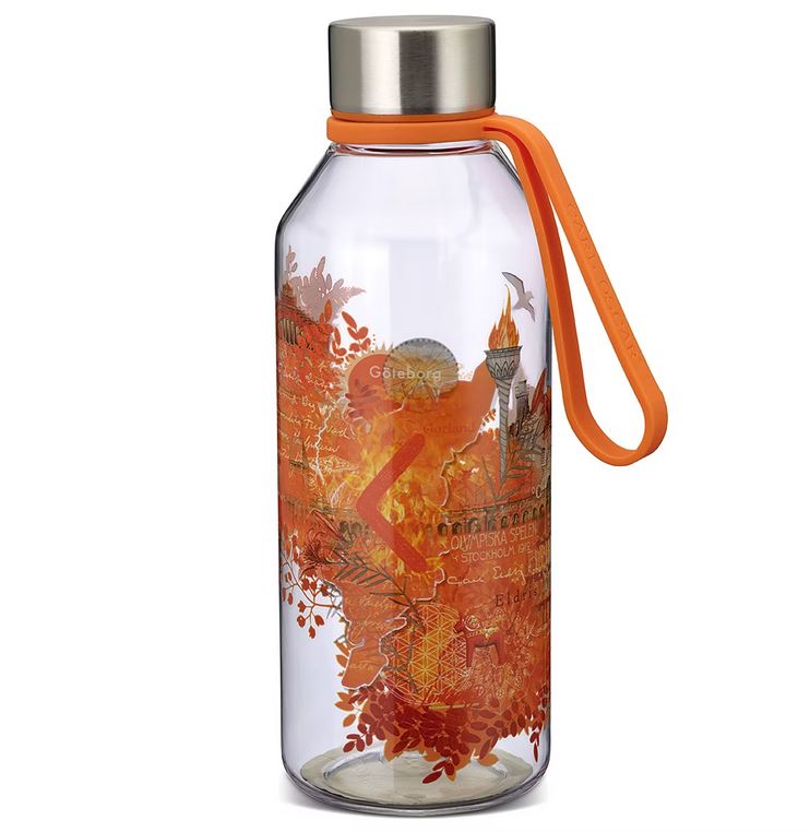 A high quality and extremely durable water bottle made of BPA-free TritanTM copolyester plastic. It has very low weight, is 100 % leak proof and holds 0.65 L. It is also comes with a silicone strap for easy carrying. Tritan plastic is both very heavy-duty and means no retention or imparting of flavours. Wash by hand to protect the illustration. Not for use in a microwave or freezer.