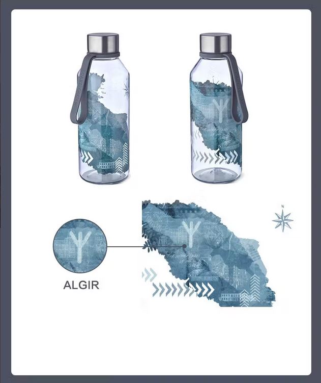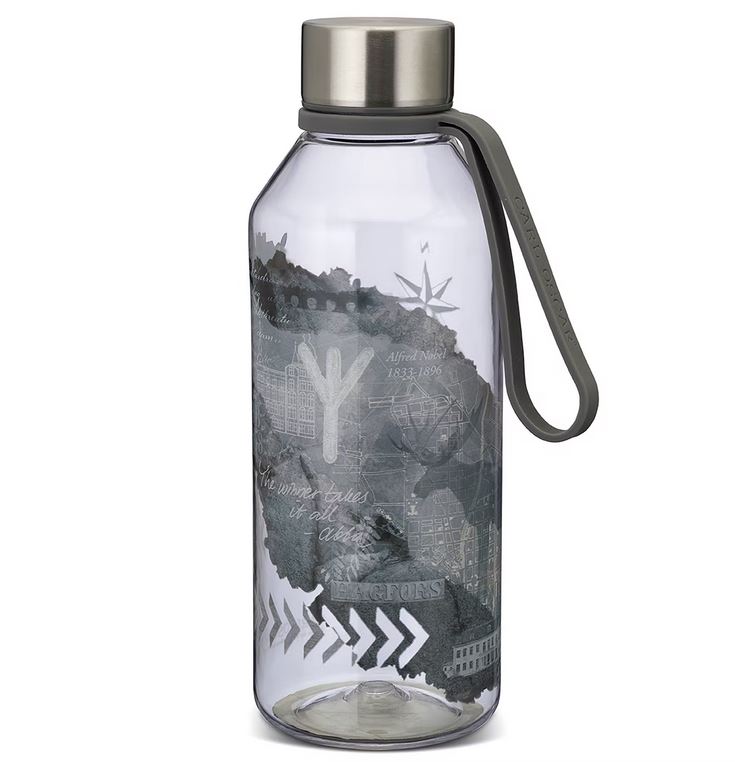 A high quality and extremely durable water bottle made of BPA-free TritanTM copolyester plastic. It has very low weight, is 100 % leak proof and holds 0.65 L. It is also comes with a silicone strap for easy carrying. Tritan plastic is both very heavy-duty and means no retention or imparting of flavours. Wash by hand to protect the illustration. Not for use in a microwave or freezer.