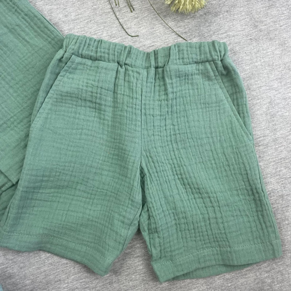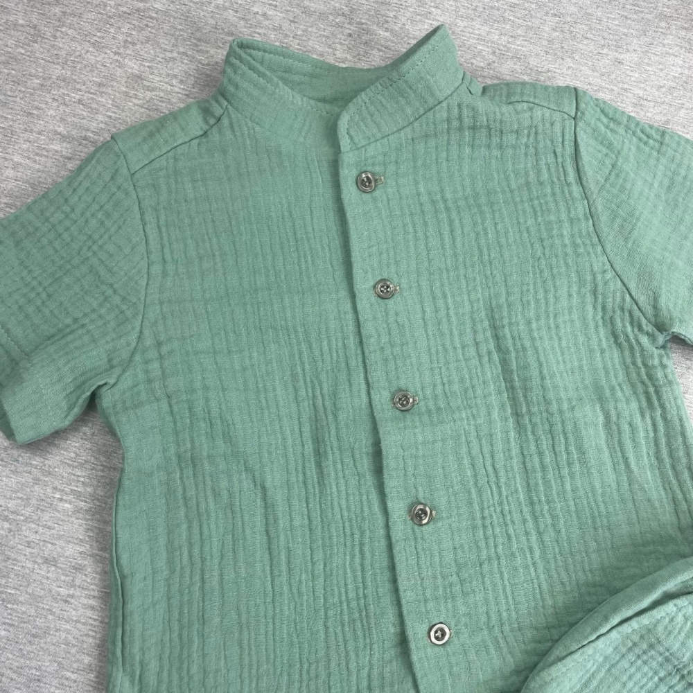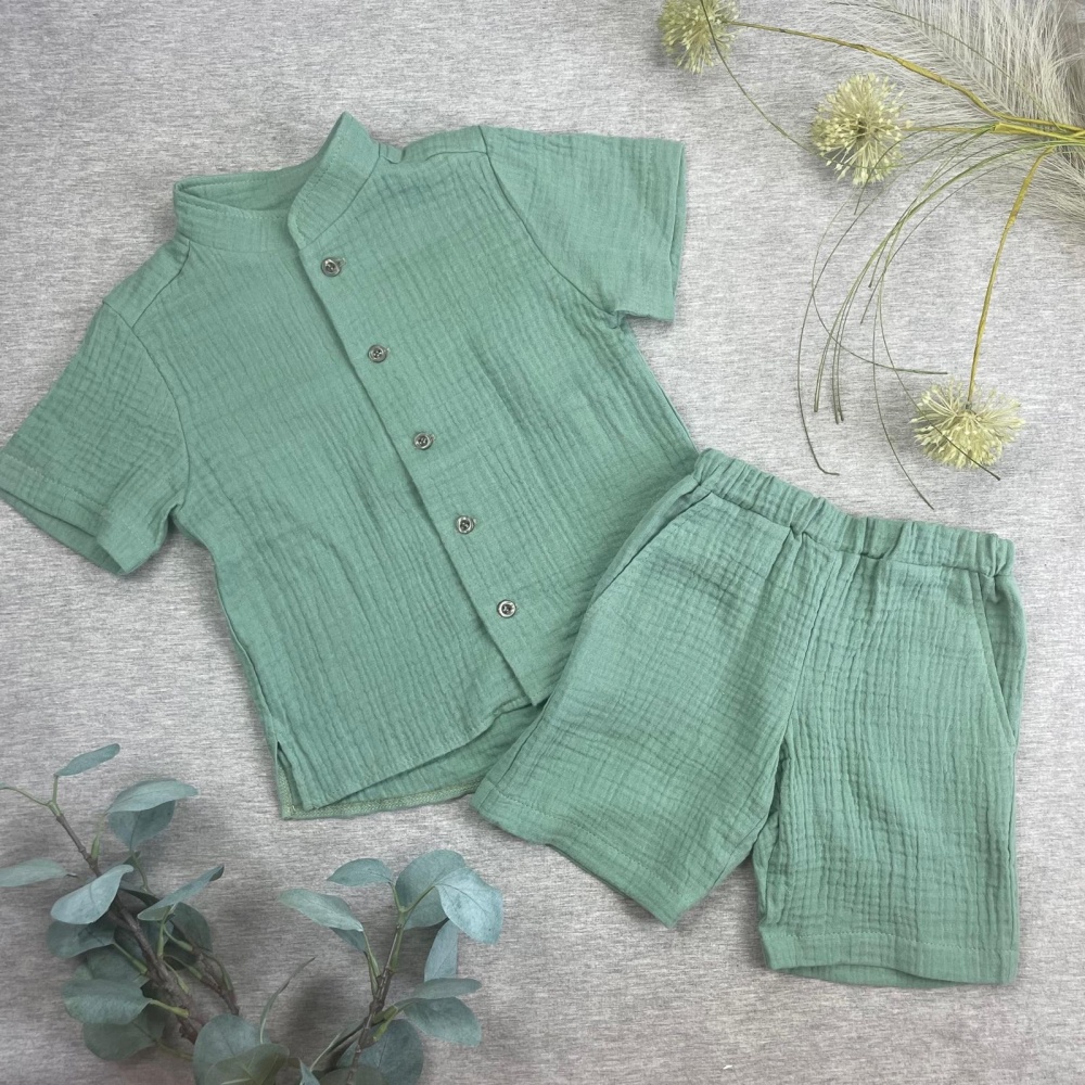 Cotton muslin boy's set: shirt and shorts OLIVE