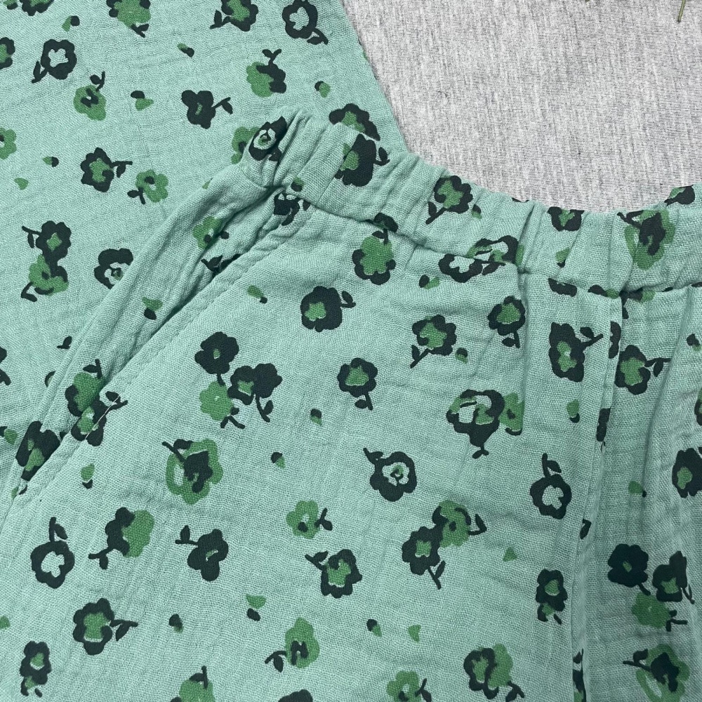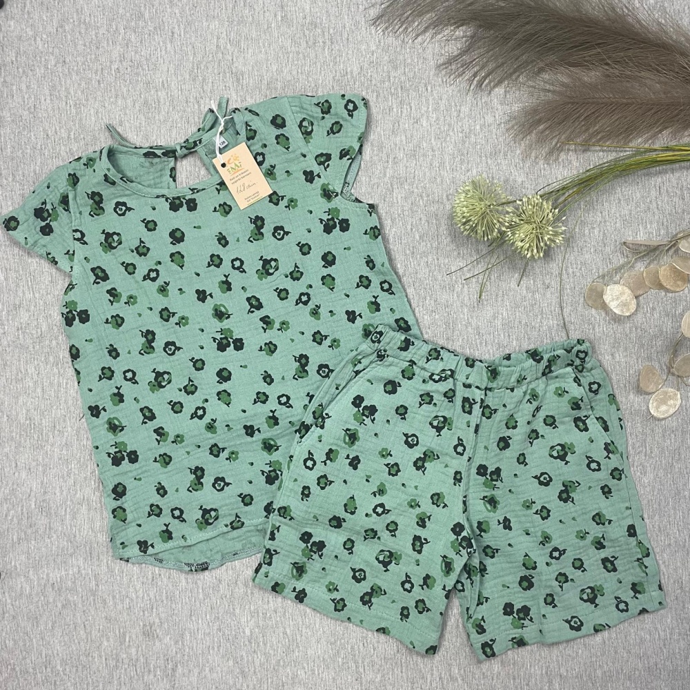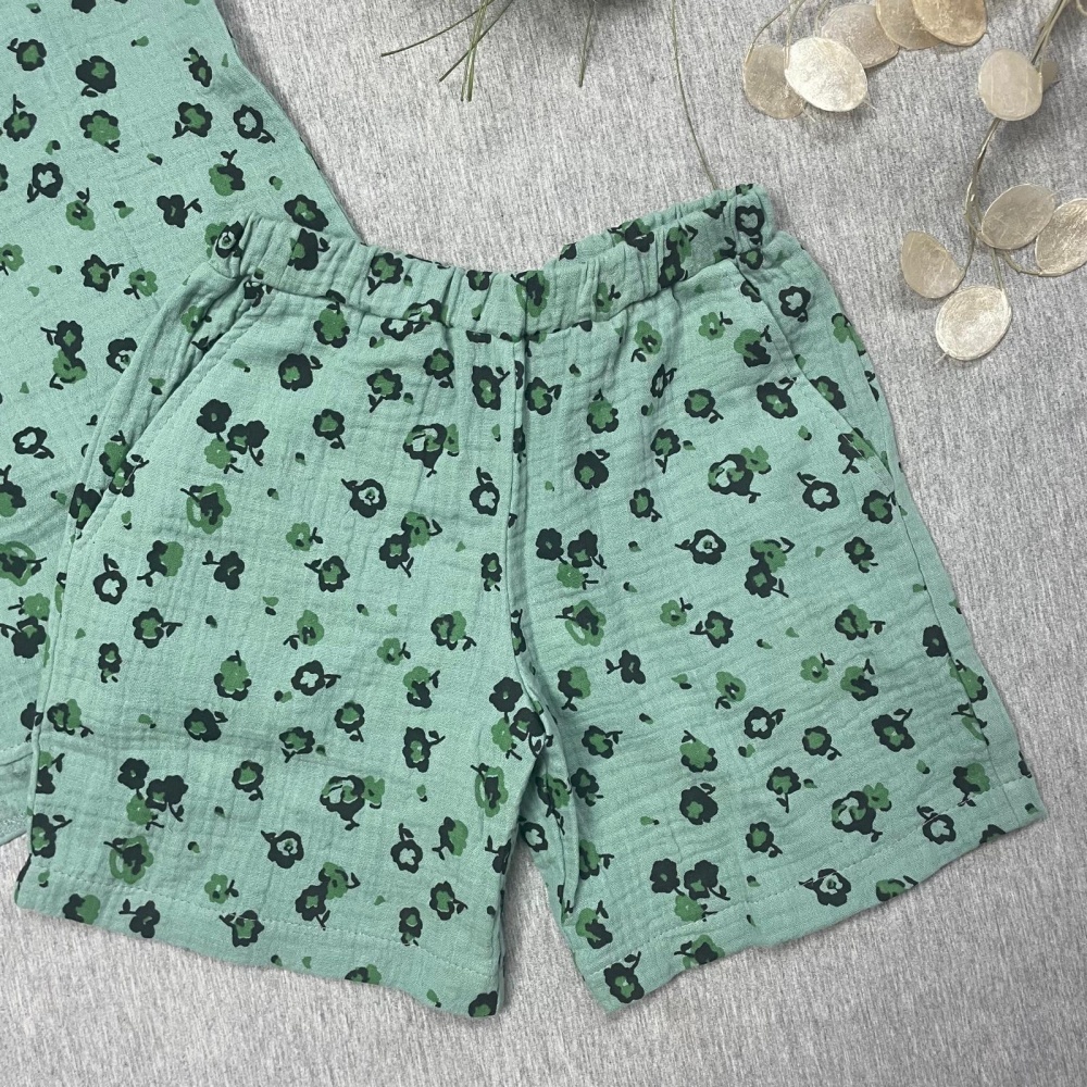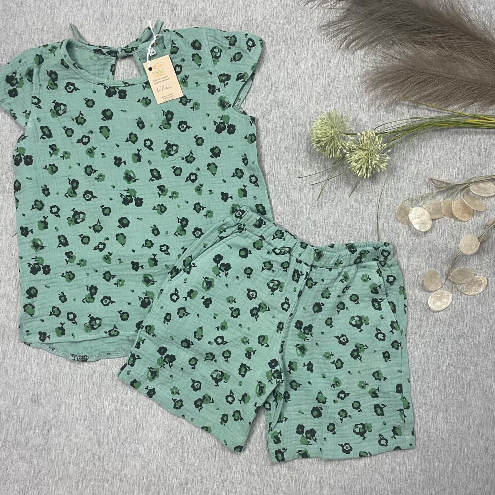 Cotton muslin boy's set: shirt and shorts MODERN MINT flowers