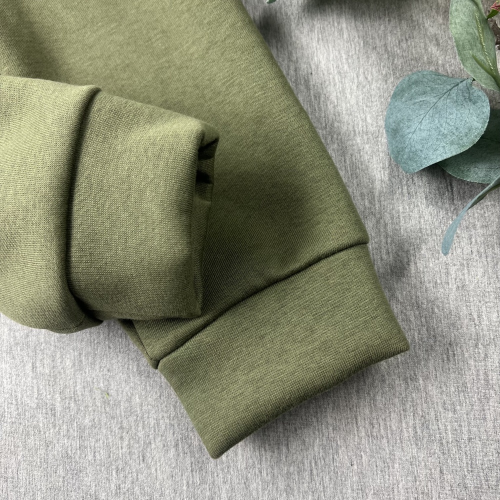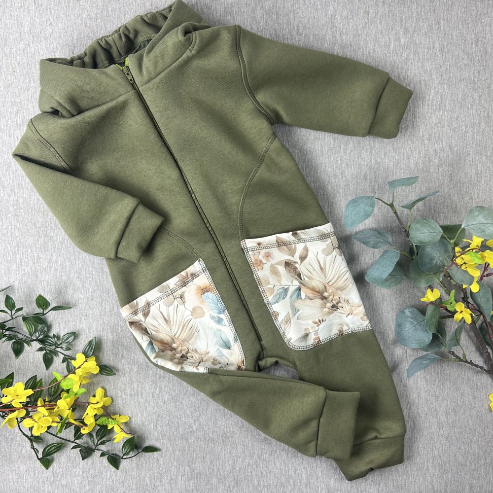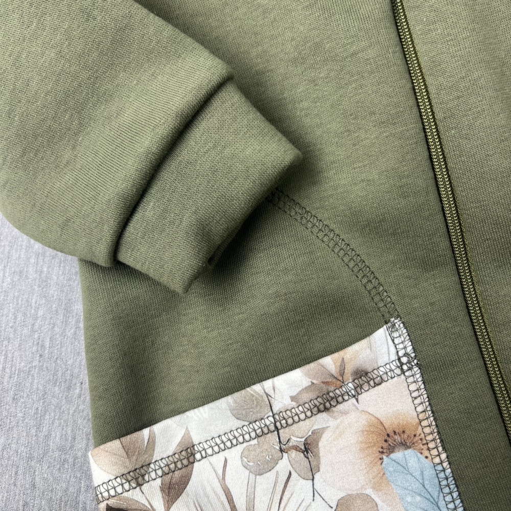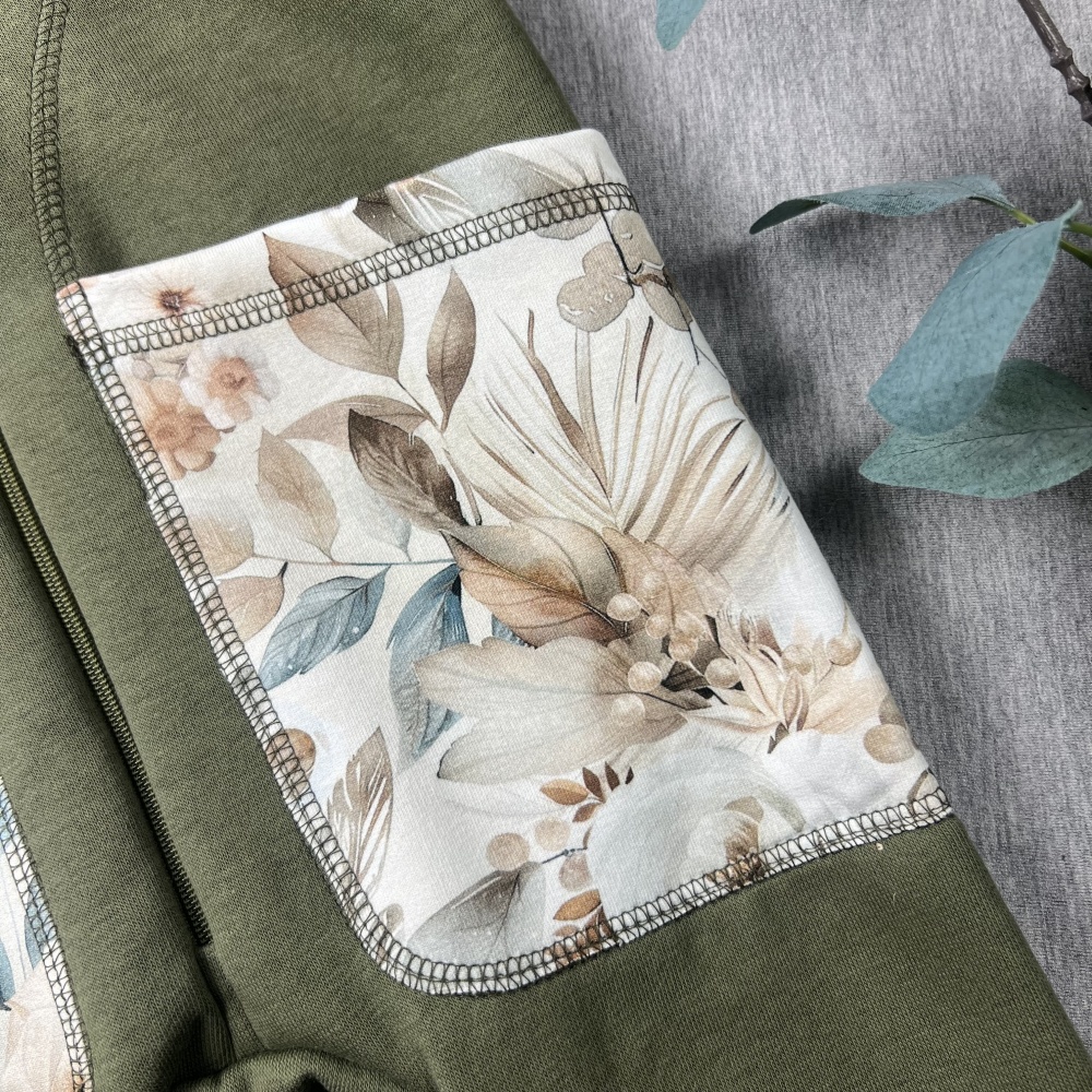 Kids cotton fleece sweatsuit with pockets, Haki/Flowers