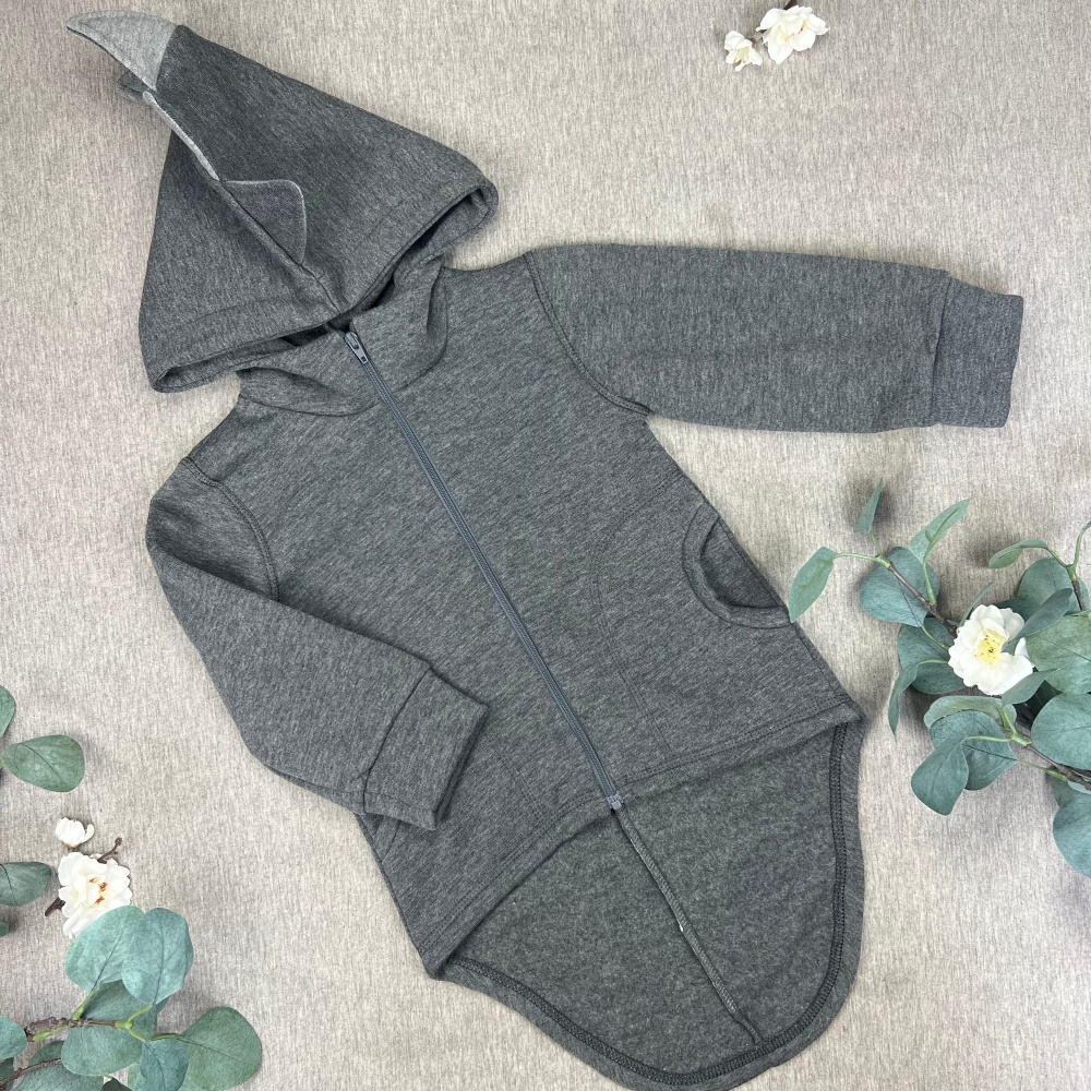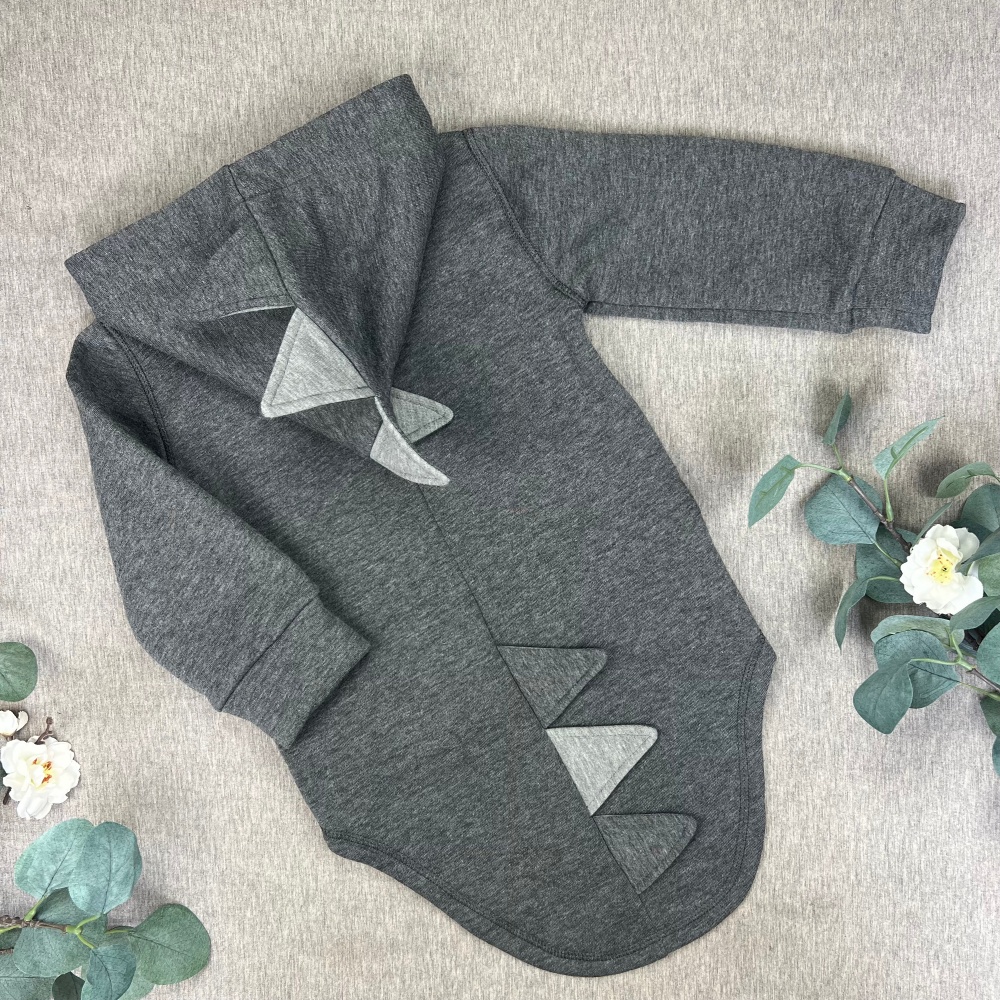 The jacket has an extended back, imitating a dinosaur's tail. On the hood and tail part jacket has dinosaur horns in different colors.