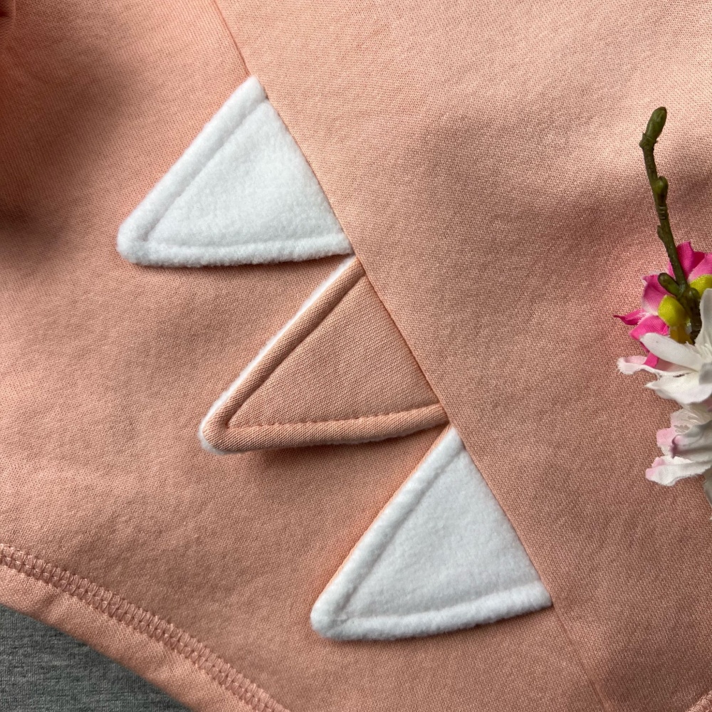 The jacket has an extended back, imitating a dinosaur's tail. On the hood and tail part jacket has dinosaur horns in different colors.