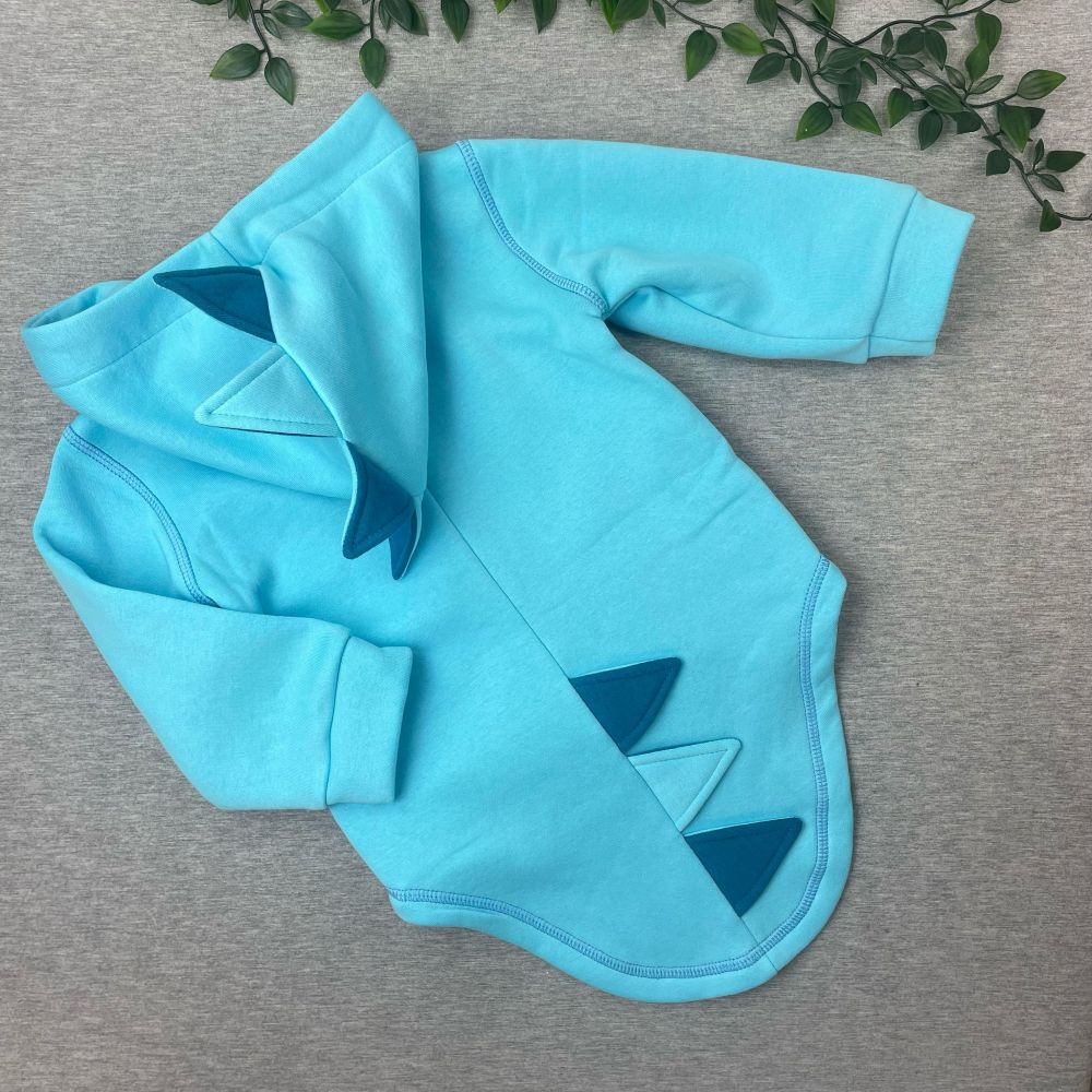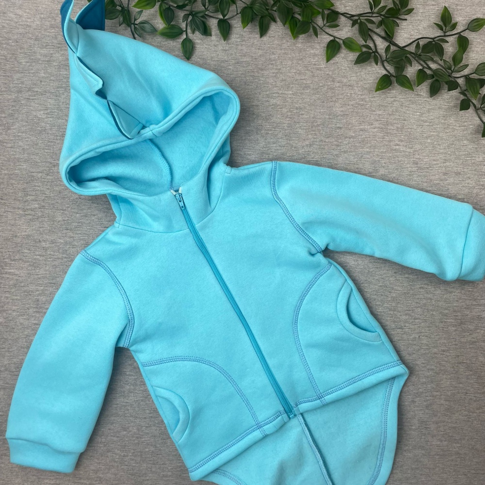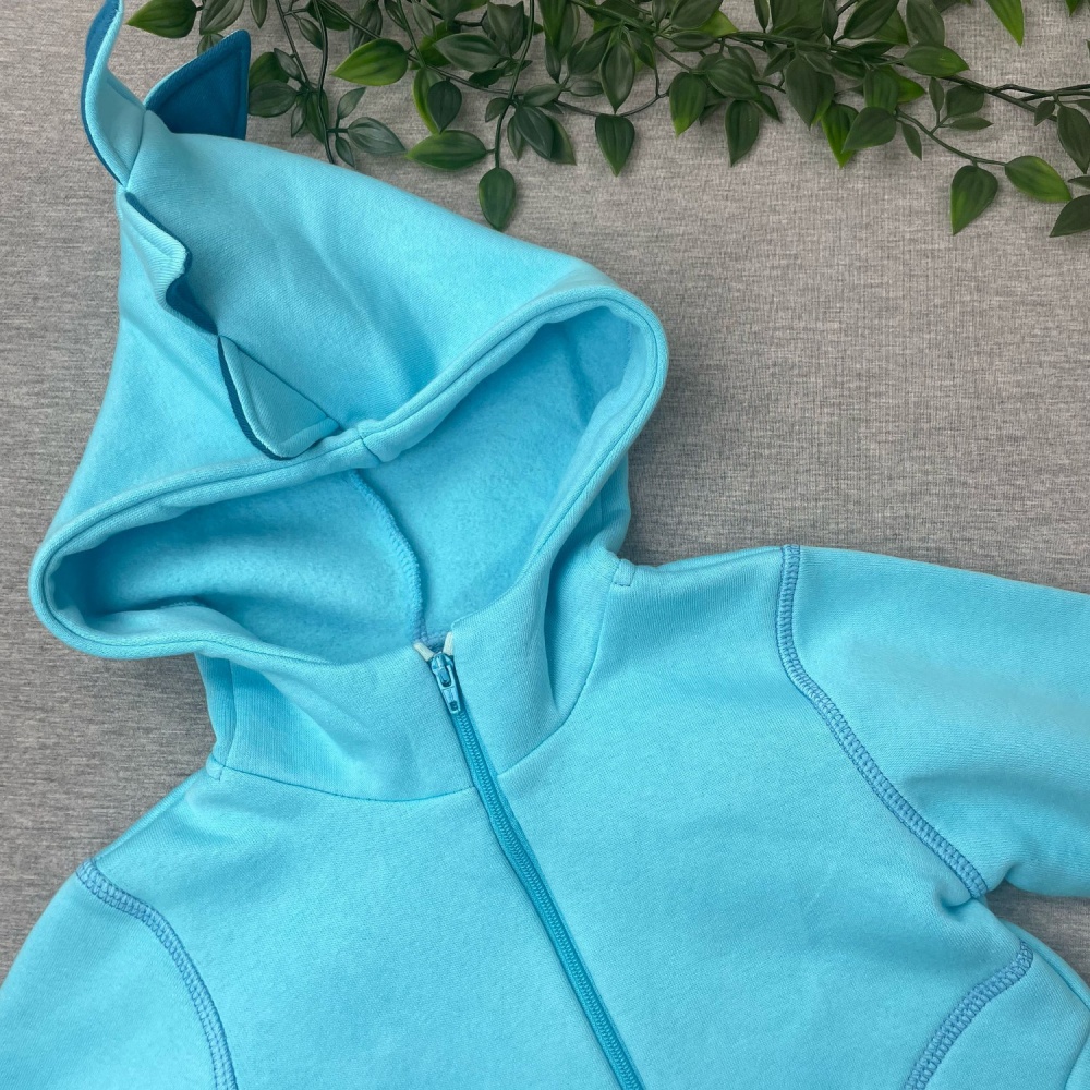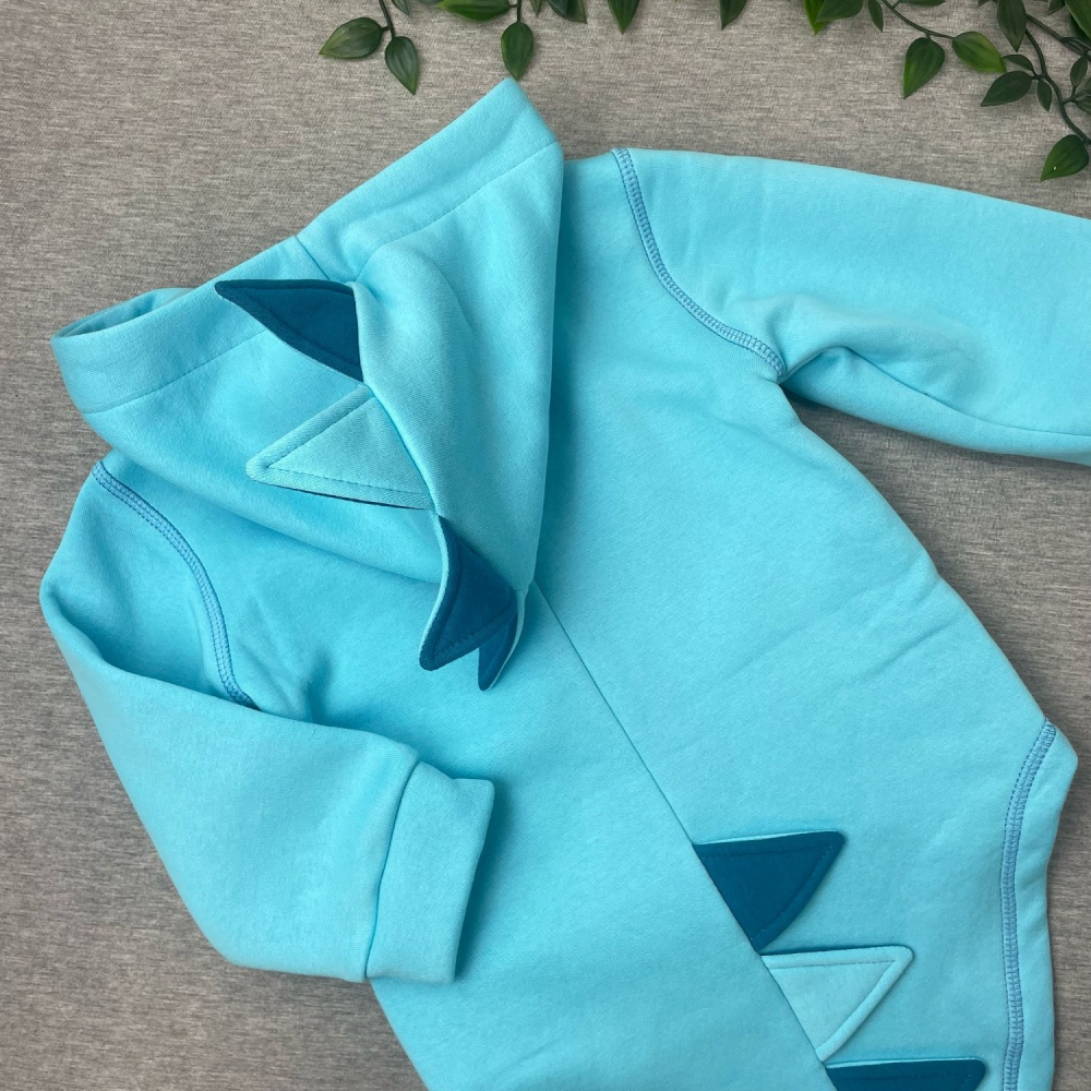 The jacket has an extended back, imitating a dinosaur's tail. On the hood and tail part jacket has dinosaur horns in different colors.