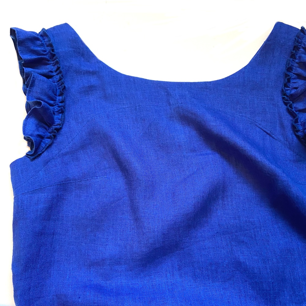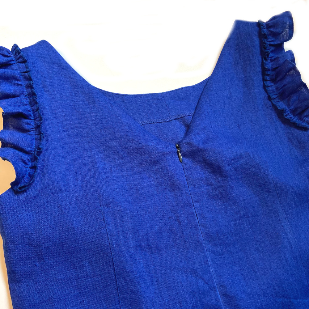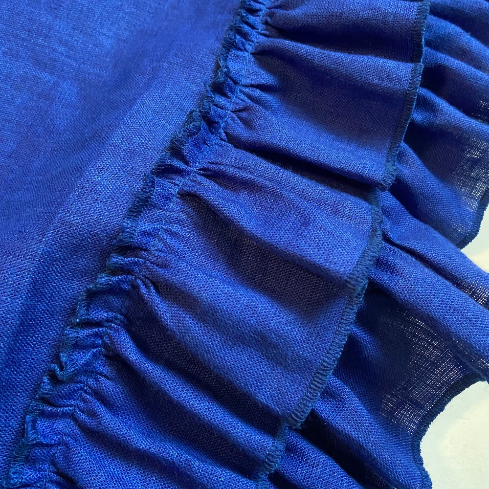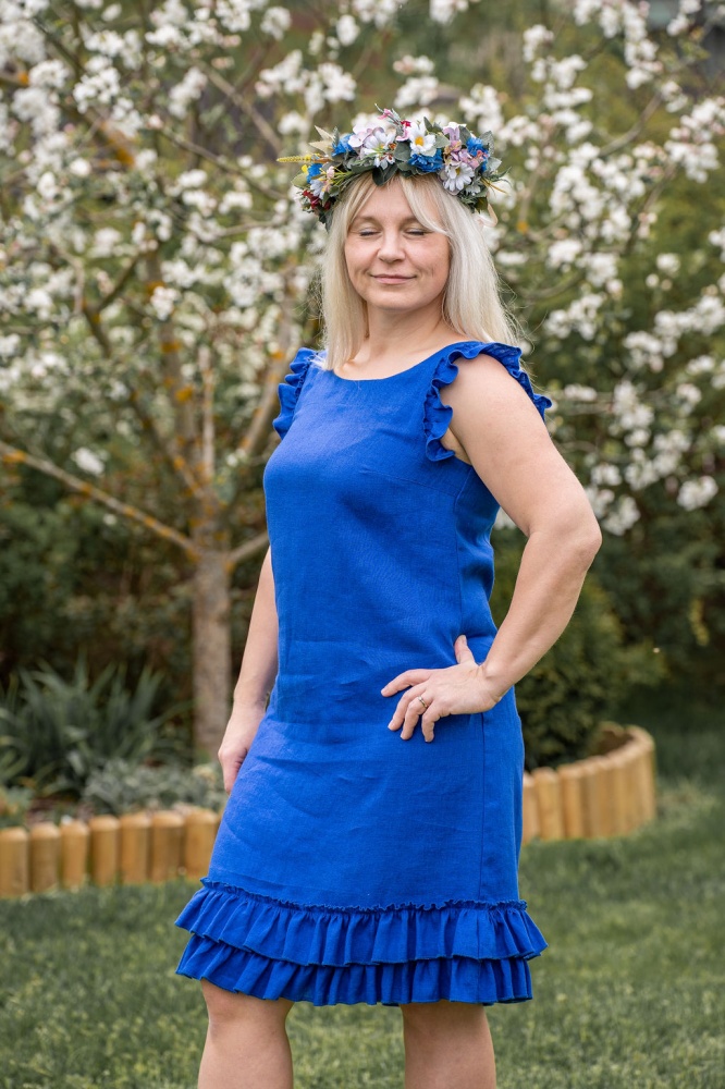 Woman linen dress with frills in bright and expressive royal blue color