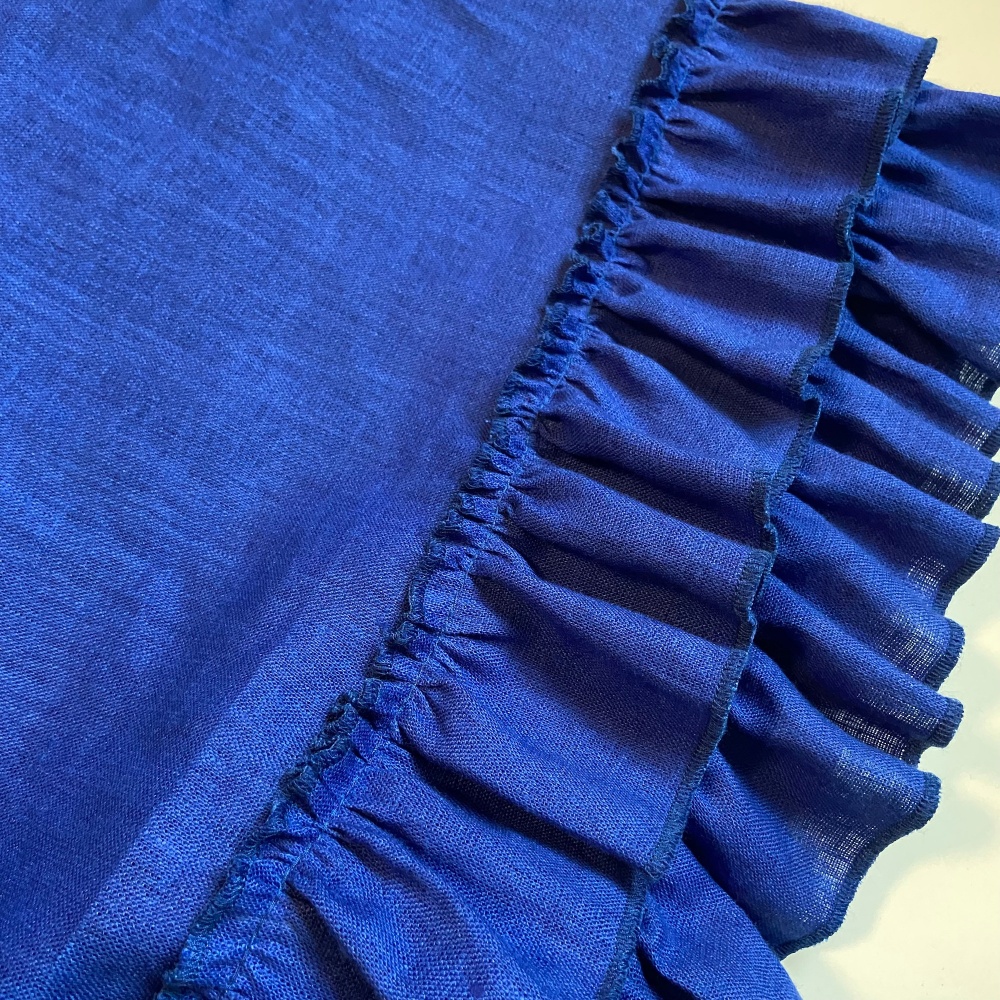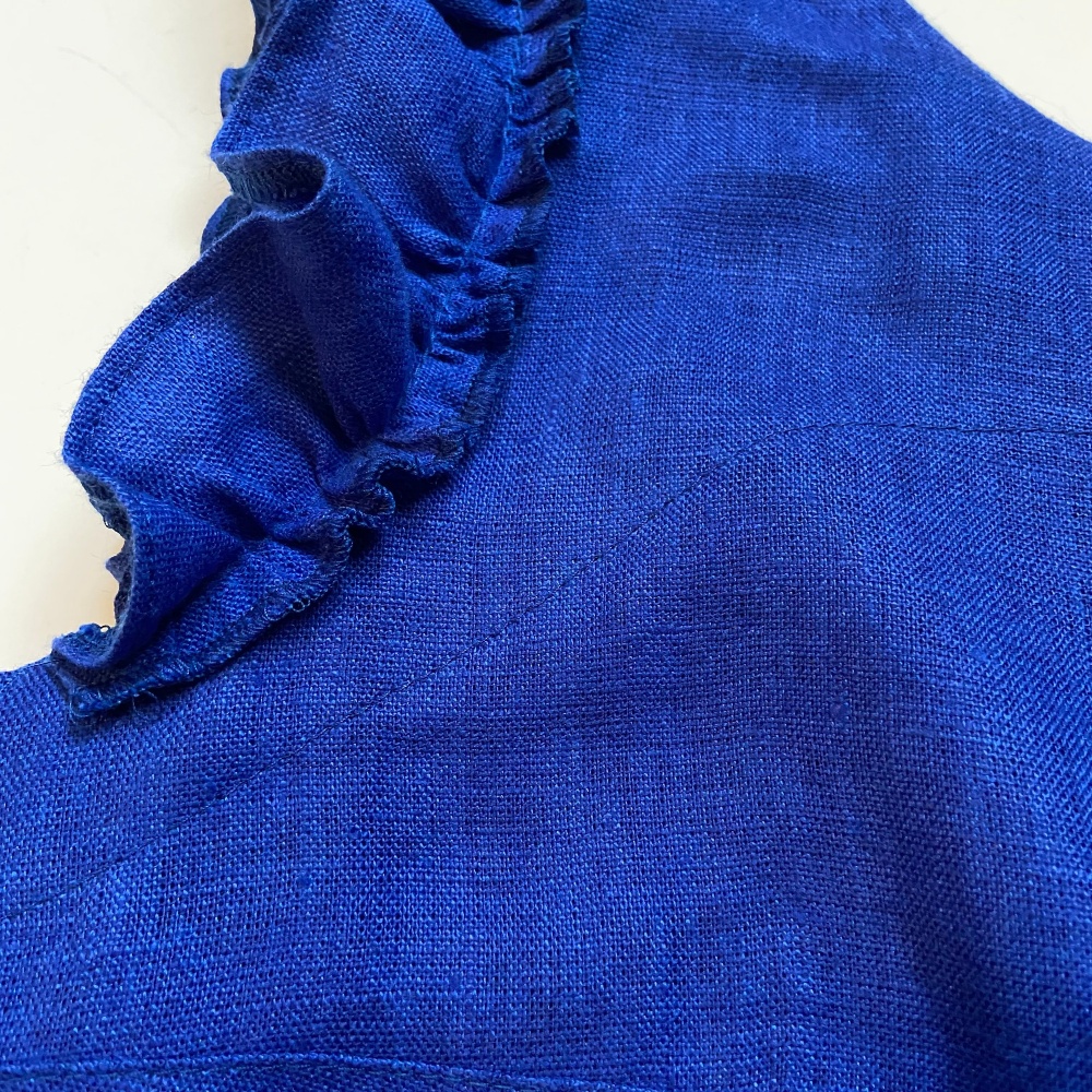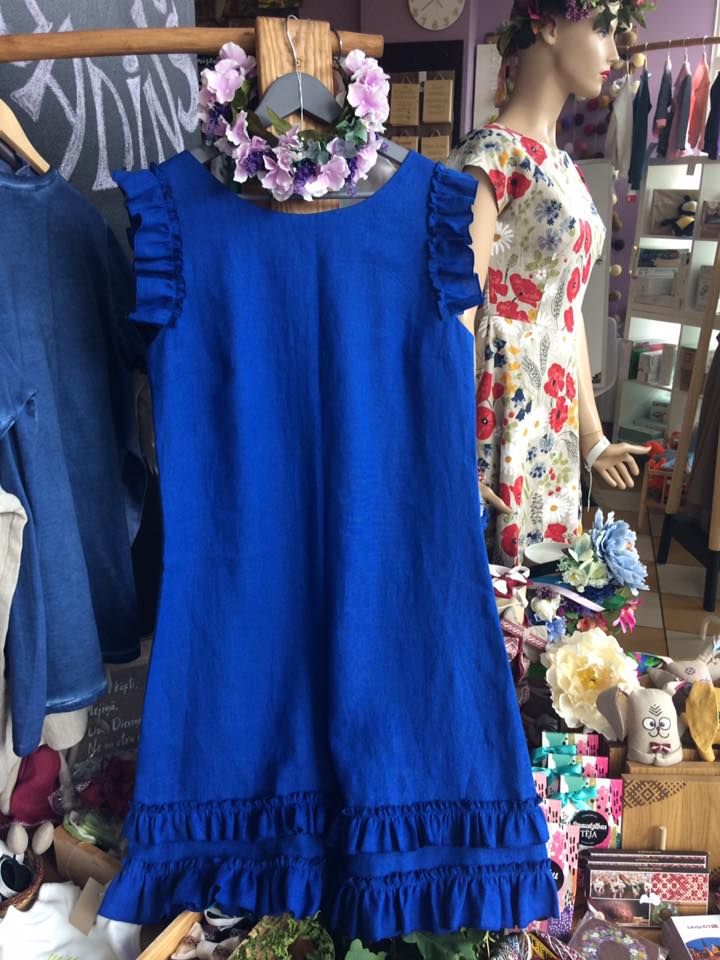 Woman linen dress with frills in bright and expressive royal blue color
