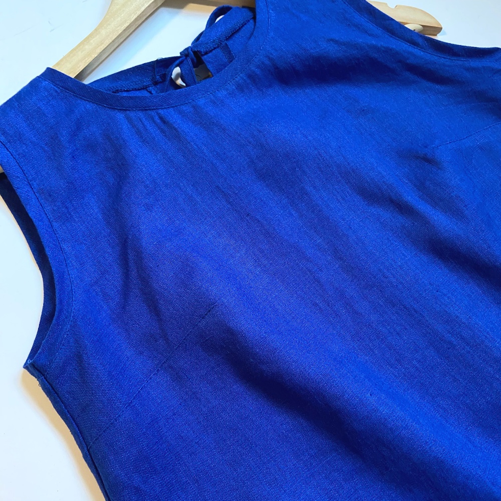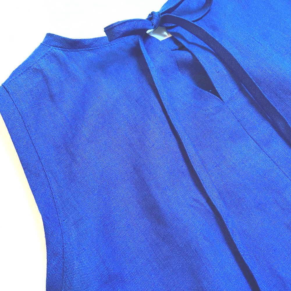 Woman linen dress with frills in bright and expressive royal blue color