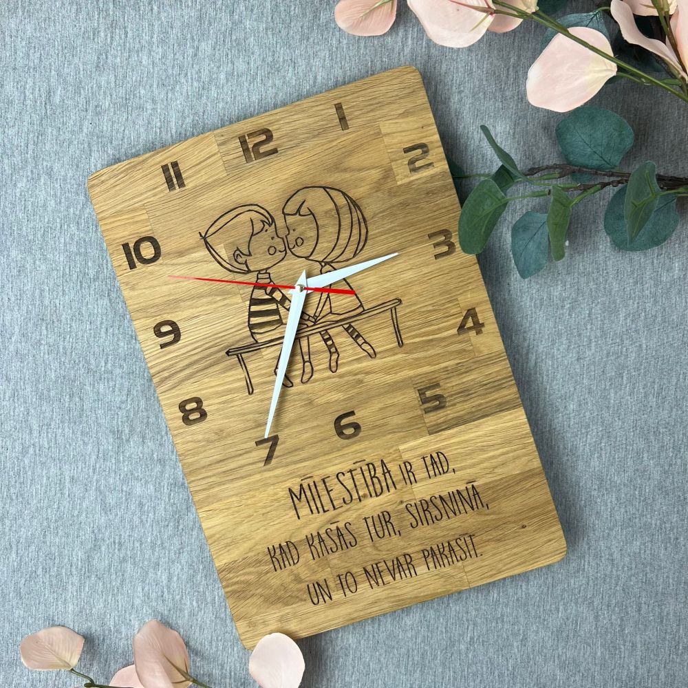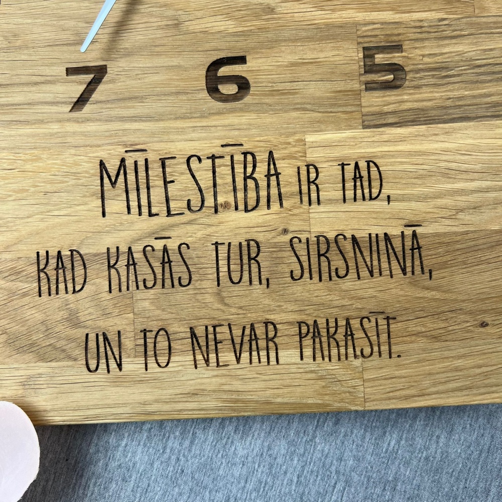 Wooden clock, "Mīlestība ir tad, kad kasās tur, sirsniņā, un to nevar pakasīt"