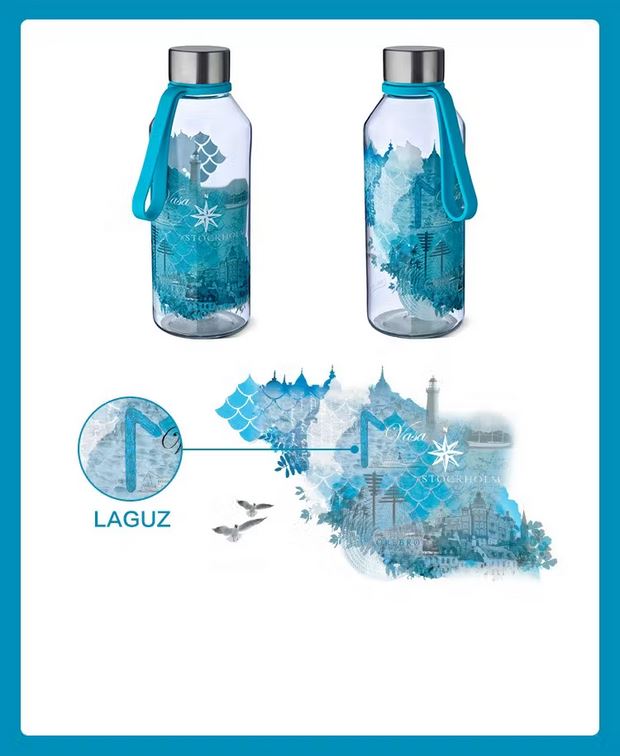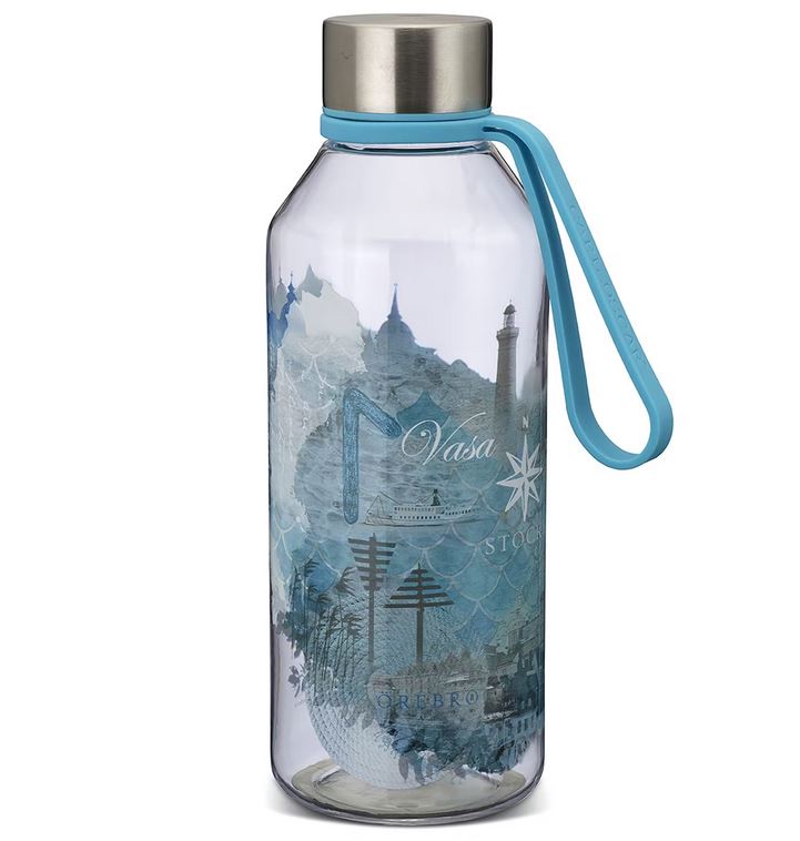 A high quality and extremely durable water bottle made of BPA-free TritanTM copolyester plastic. It has very low weight, is 100 % leak proof and holds 0.65 L. It is also comes with a silicone strap for easy carrying. Tritan plastic is both very heavy-duty and means no retention or imparting of flavours. Wash by hand to protect the illustration. Not for use in a microwave or freezer.