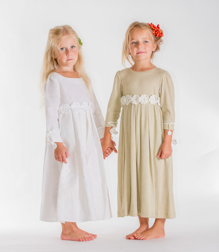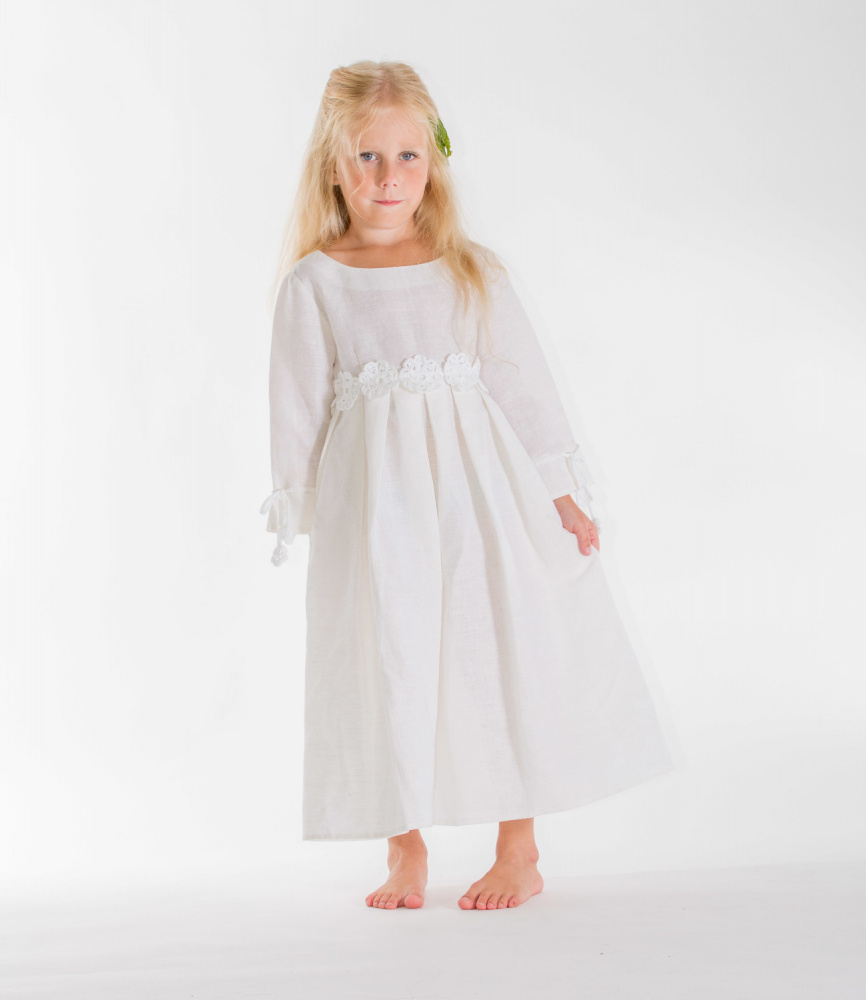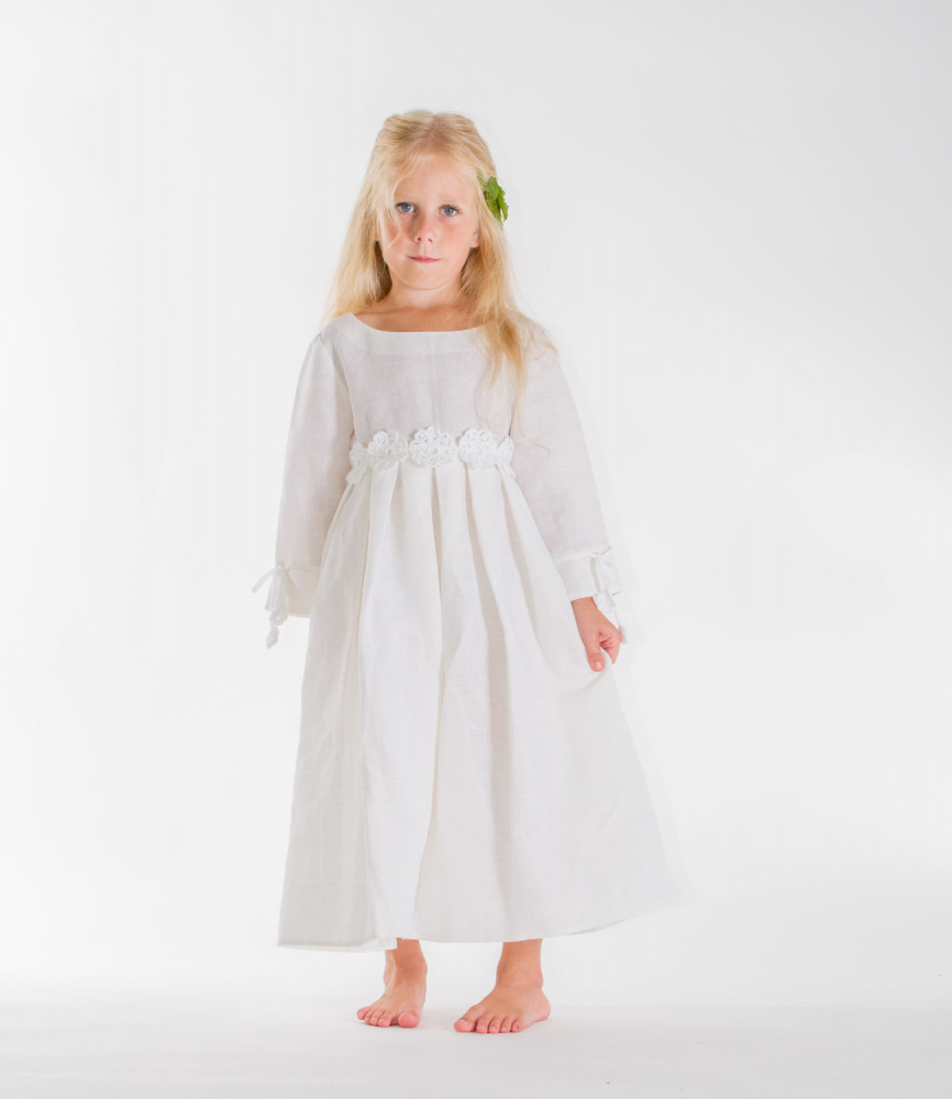 Linen dress with crocheted flowers, white