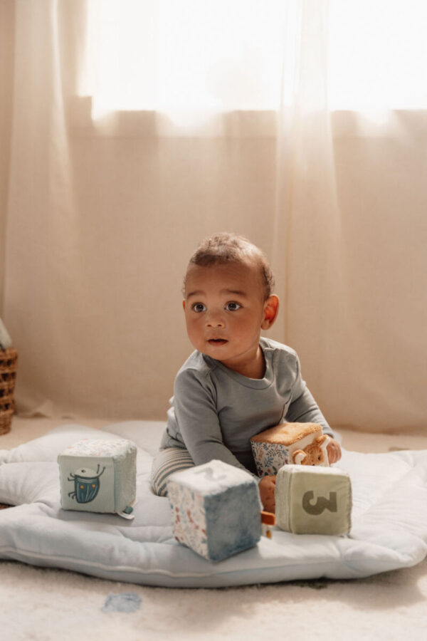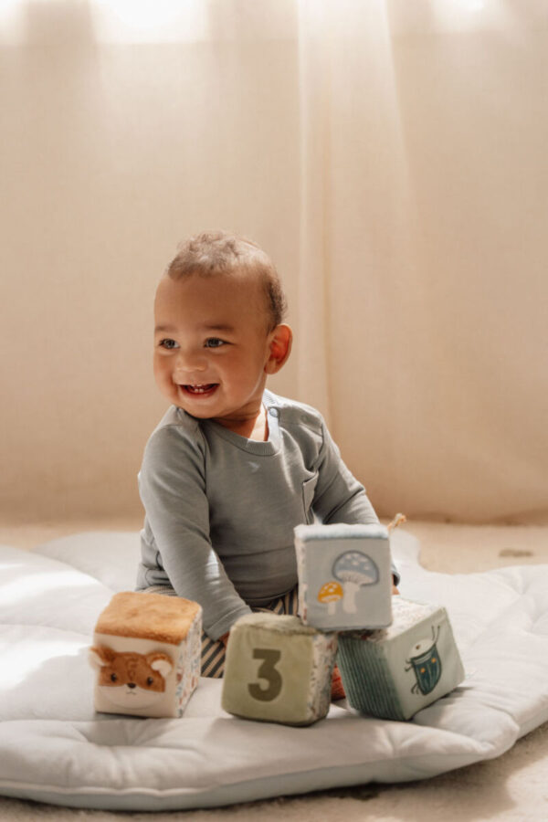 Ring, ring, rattle. With different sounds, textures, and colors to discover, this cheerful set of soft activity blocks from the Forest friends collection will keep your little one busy for hours. In addition, your child’s hand-eye coordination is stimulated in a playful way. The set consists of 4 sensory blocks, each defined by soft colors and a unique number. Baby hands will also discover fun labels, plush panels, and a sunny mirror.