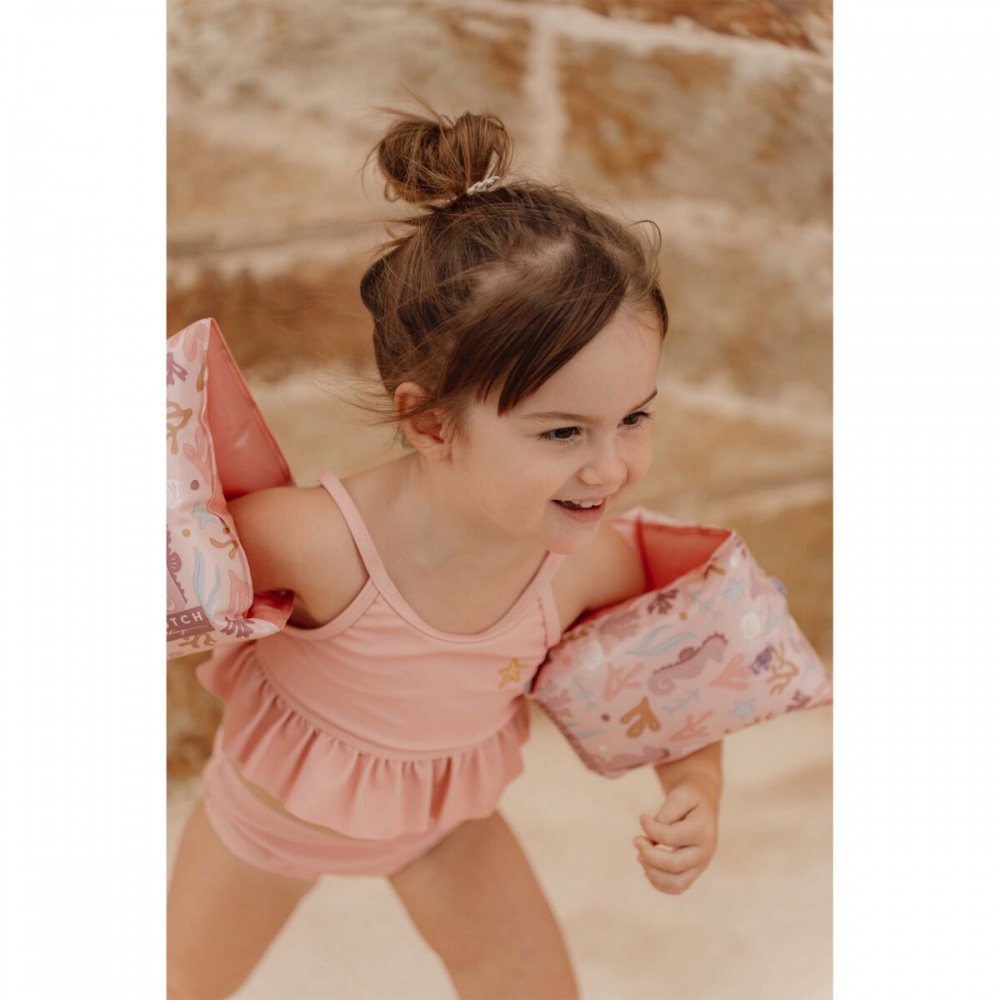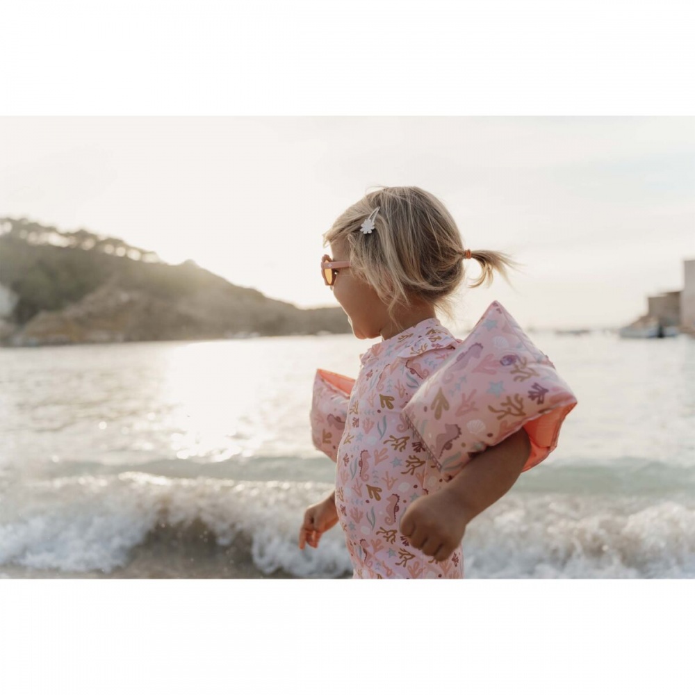 Two 'Ocean Dreams Pink' pink swim armbands decorated with sea figures. The swim armbands provide support for the first adventures in the water. The inflatable children's swim armbands have air chambers with a valve. The sea figures shine in the background, making the children stand out well with these summery swim armbands.