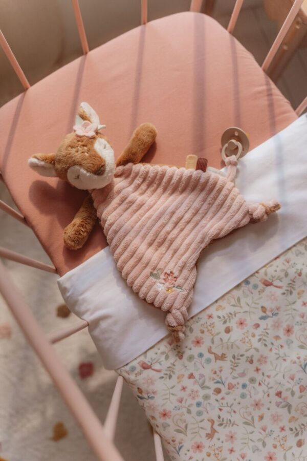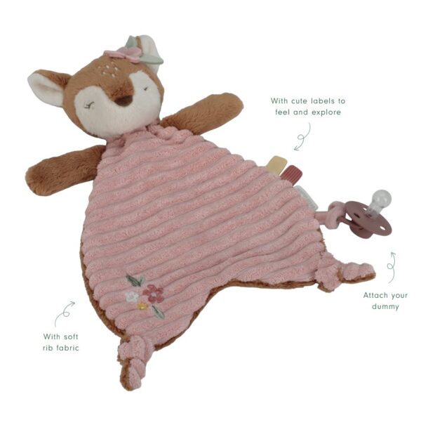 The friendly deer will soothe you with its magical softness, offering a comforting embrace whenever you need a buddy by your side. The soft cloth of its body features delightful details including playful labels, a Fairy Garden embroidery, and two knots for tiny hands to grasp and hold onto. With the convenient loop, it’s easy to attach a pacifier to keep it close.