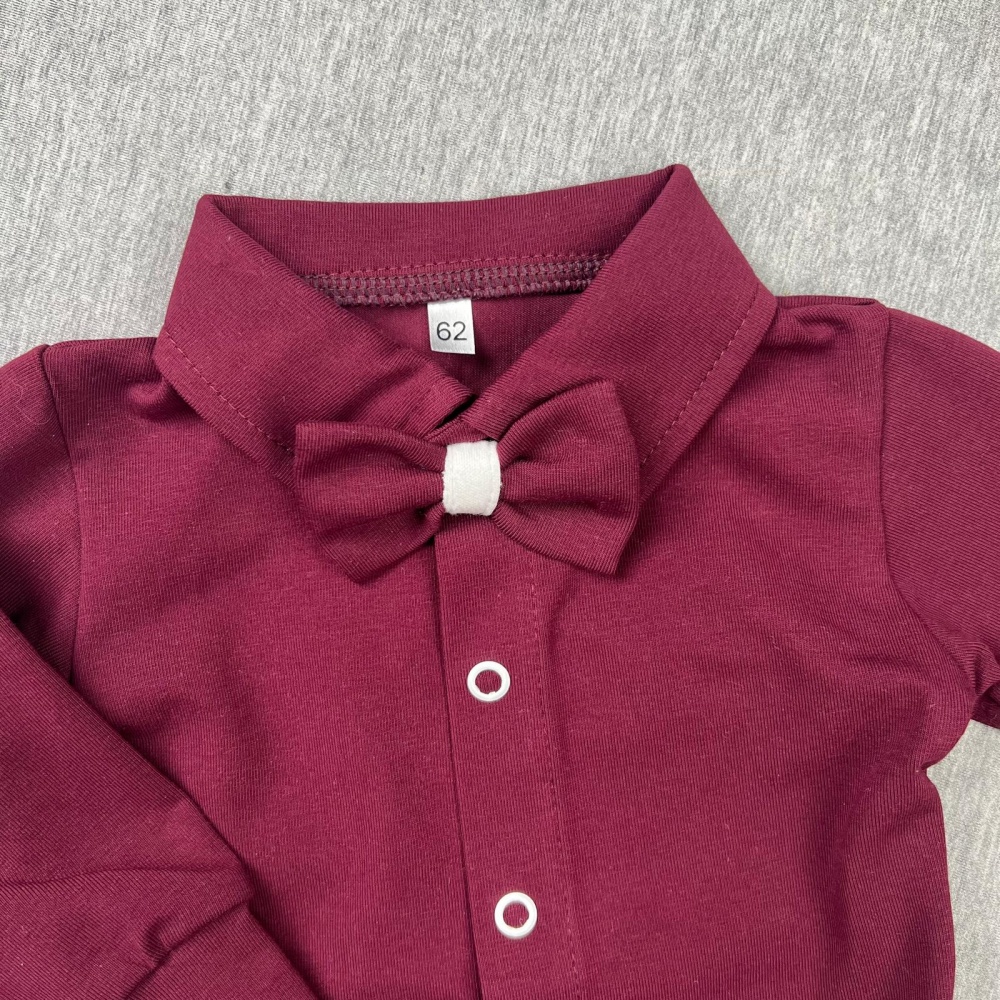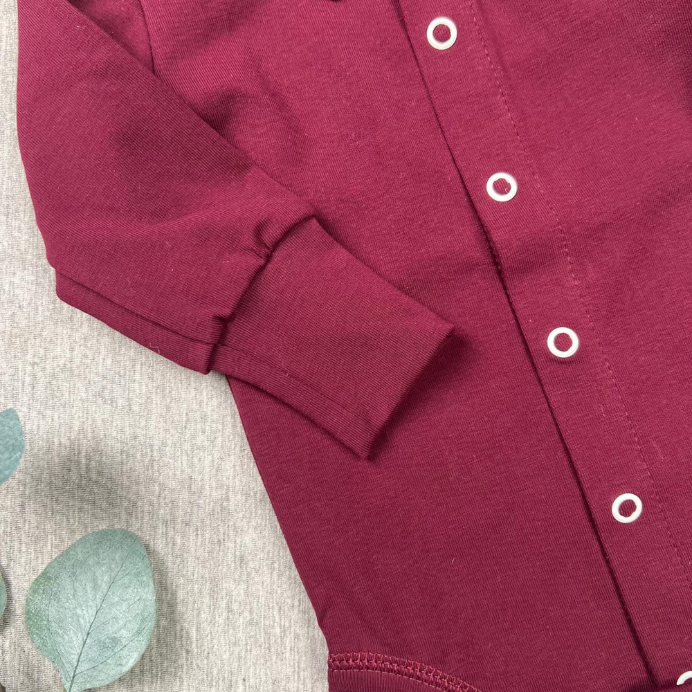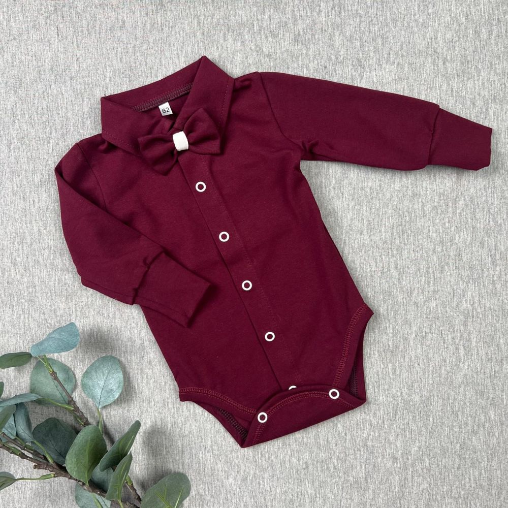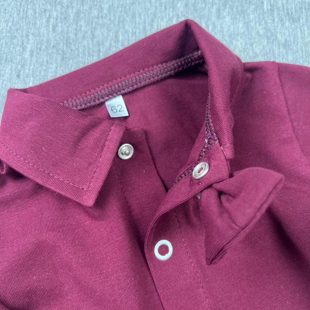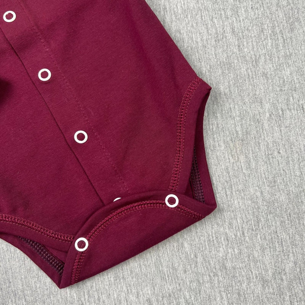 This adorable and trendy button down bodysuit shirt will turn every little guy into a little gentleman. The shirt has a small collar. Front side of bodysuit has blue trimming and blue collar.
