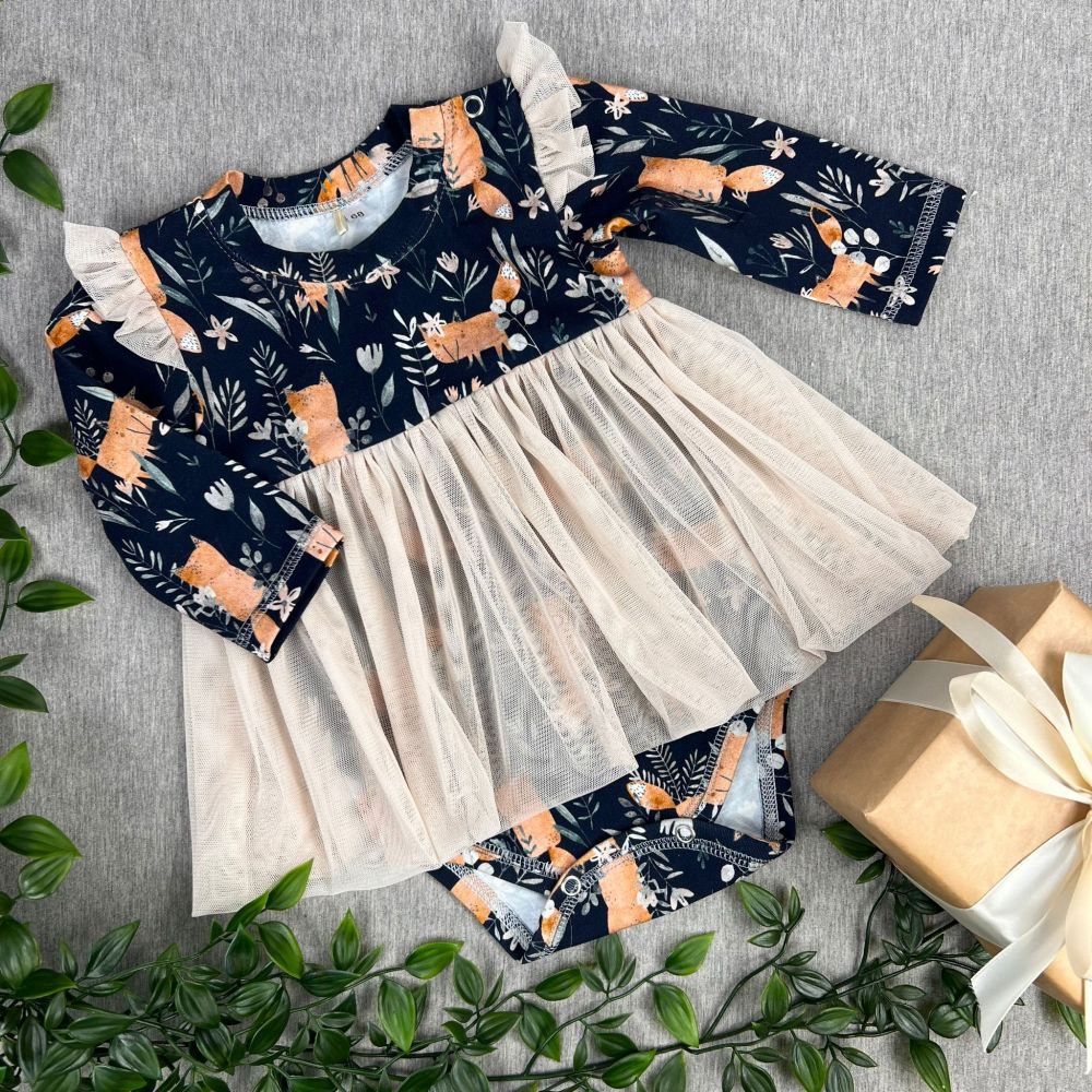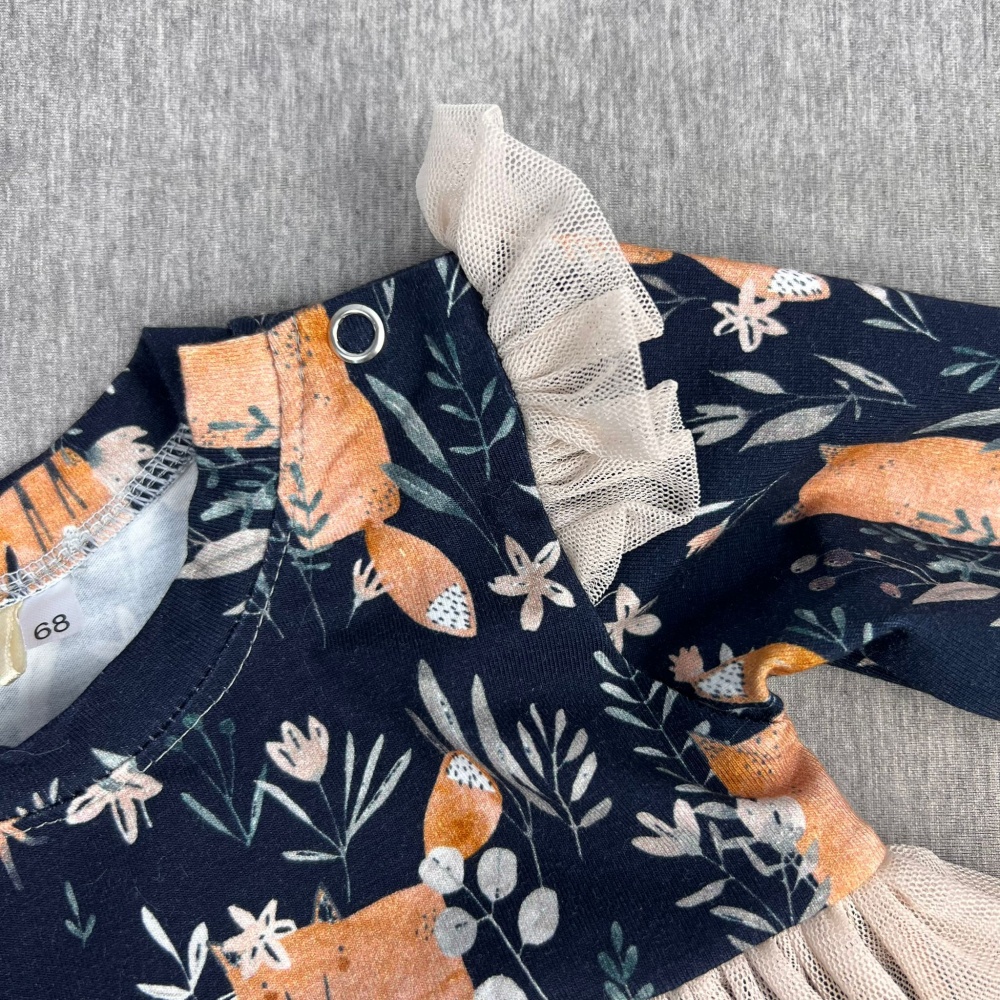 Made of very soft and skin-friendly eco-cotton fabric with a yellow tulle ruffle.