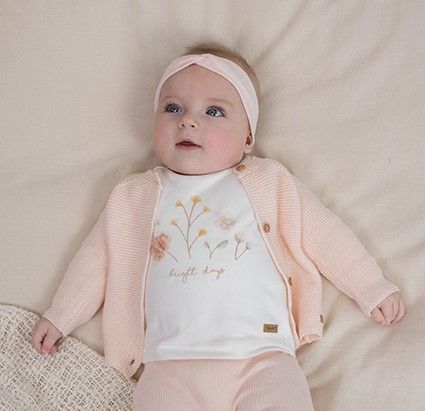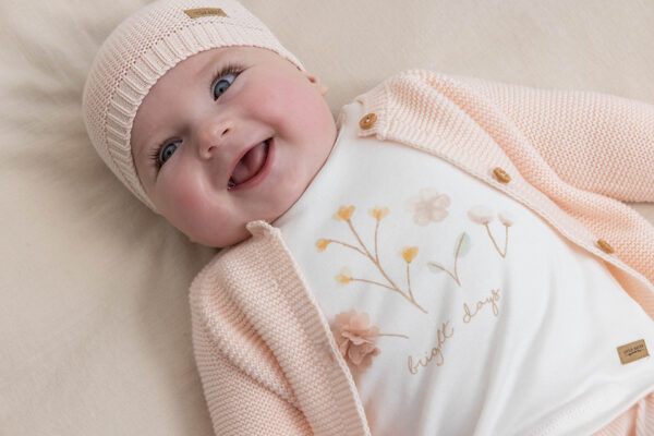 The jacket is made of wonderfully soft material and has five push buttons. Available in three different colors. Complete the outfit with a one-piece suit, booties and a cap made by Little Dutch.
