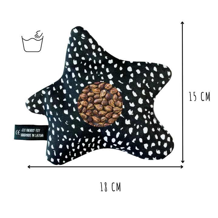 - The toy is handmade in limited quantities from locally designed black&white 100% cotton fabric which has OEKO TEX Standard 100 certification. The GOTS 6.0 certified inks that have been used for fabric printing are water-based. No harmful chemicals are used in the printing process. The safety of inks complies with strict European requirements for environmental compatibility and is safe for children.