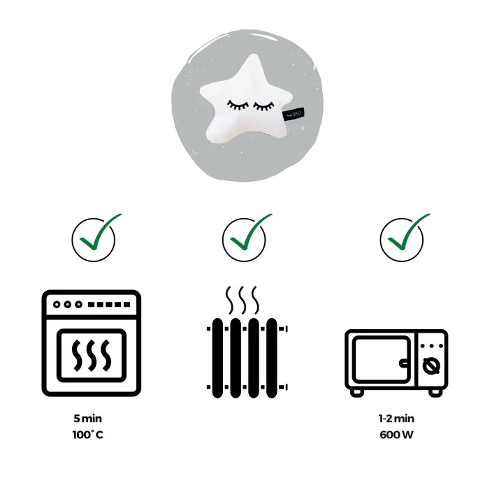 Little Star could be heated in a microwave*, in an oven*, or on a radiator (instruction included in a package). Alternative - wrap in a cotton dish towel and place in a dry, clean cooking pot or crockpot. Heat on a cooktop in a low setting. The heat lasts for about ~30 minutes.