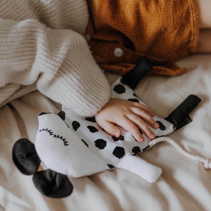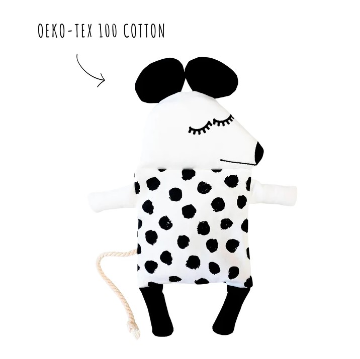 - The toy is handmade in limited quantities from locally designed black&white 100% cotton fabric which has OEKO TEX Standard 100 certification. The GOTS 6.0 certified inks that have been used for fabric printing are water-based. No harmful chemicals are used in the printing process. The safety of inks complies with strict European requirements for environmental compatibility and is safe for children.