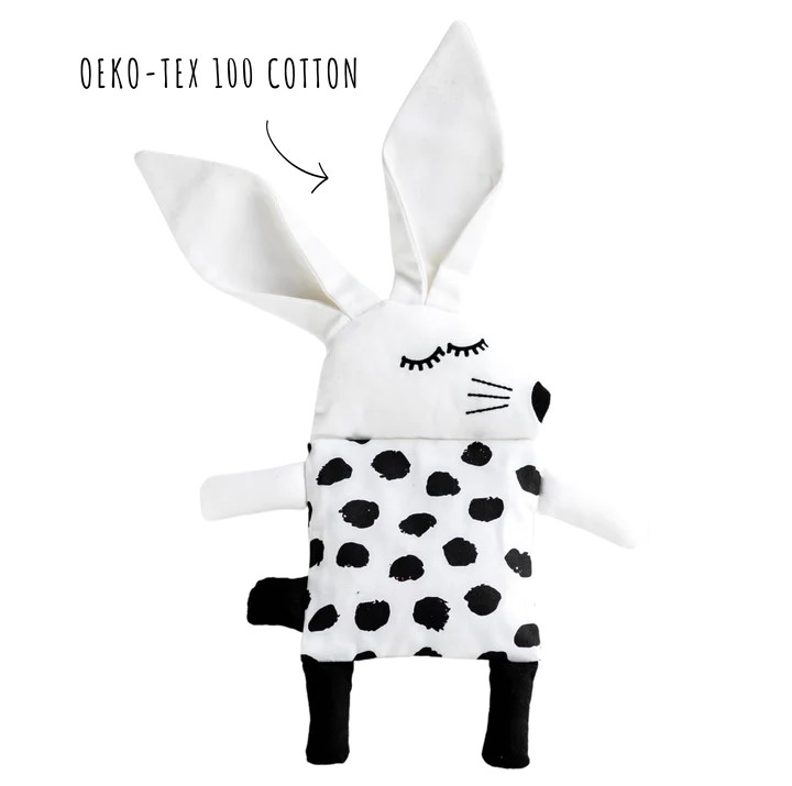 - The toy is handmade in limited quantities from locally designed black&white 100% cotton fabric which has OEKO TEX Standard 100 certification. The GOTS 6.0 certified inks that have been used for fabric printing are water-based. No harmful chemicals are used in the printing process. The safety of inks complies with strict European requirements for environmental compatibility and is safe for children.