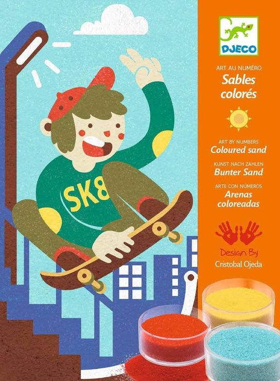 Contains 4 glue coated cards, 12 sand colours, 1 tool, 1 step by step guide.