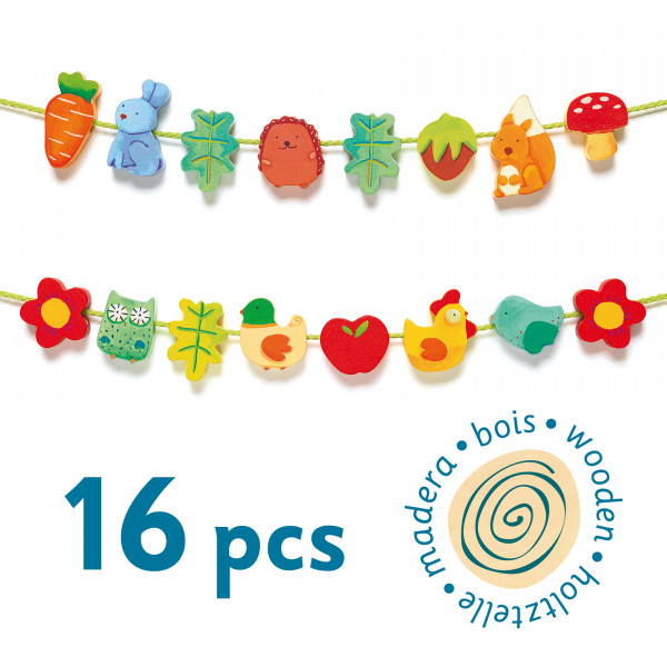 Pretty nature-themed illustrated wooden beads. Children have fun threading the beads onto the two laces, and letting their imagination run wild. Set includes 16 wooden threading beads and two threading laces. Shaped and illustrated wooden beads: animals, leaves, fruit and vegetables. Great for hand-eye coordination and counting skills. Teaches children about animals and their natural habitats. Helps develop children’s fine motor skills. Charming illustrations that little ones will love. The ends of the laces are long and rigid to make it easier to string the beads. Thick, shaped beads that are easy to catch for little hands.