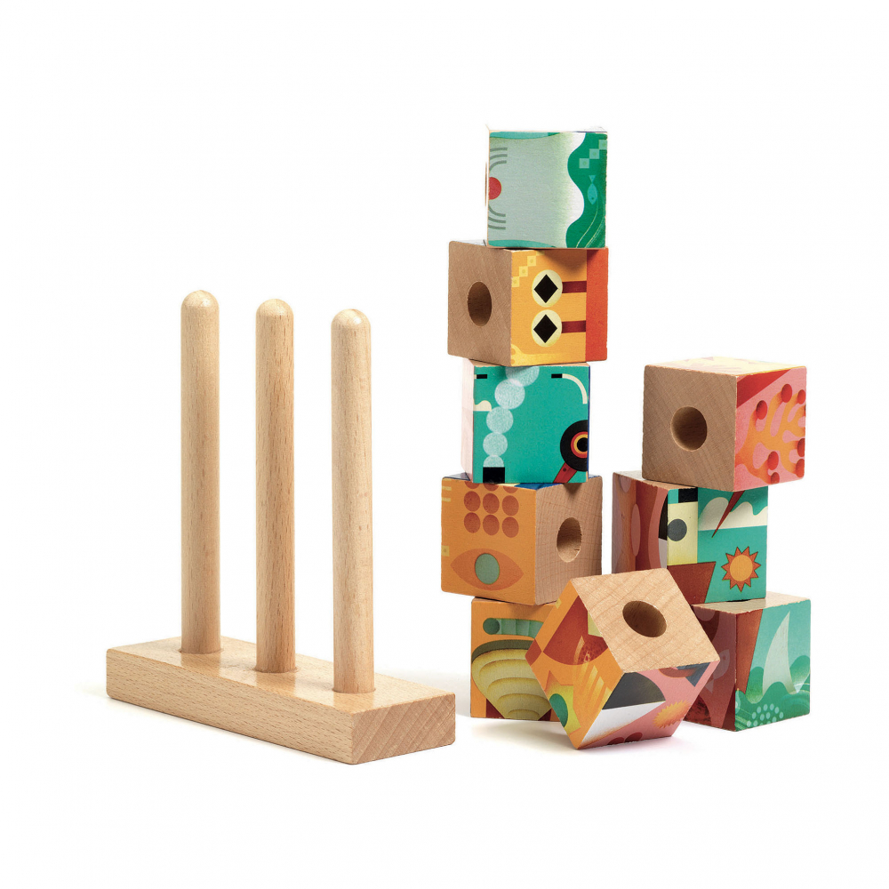 The 9 wooden blocks are threaded onto 3 vertical rods to help the child to place them correctly. Set includes 4 template cards to help the child succeed. Set includes 1 wooden base, 9 wooden blocks and 4 cardboard cards.