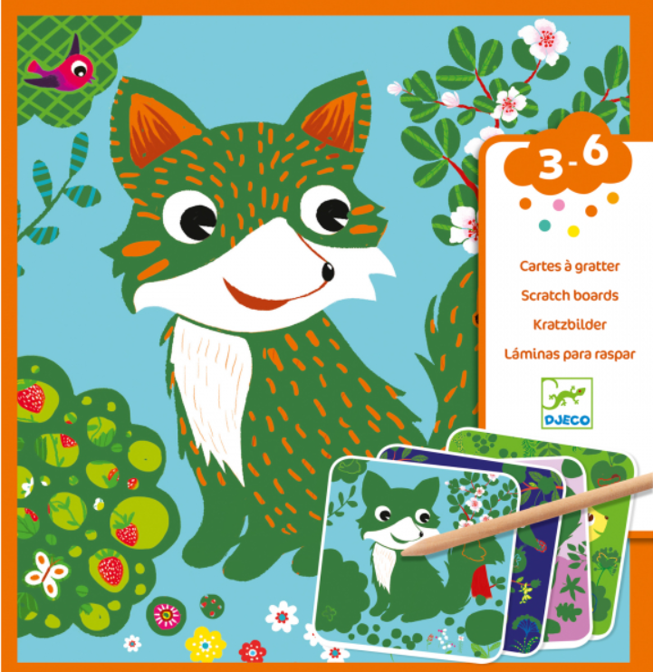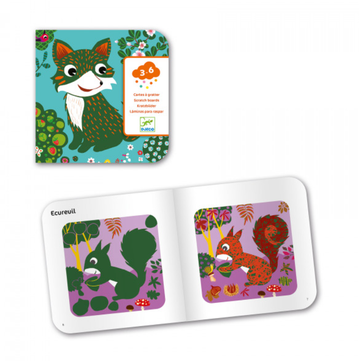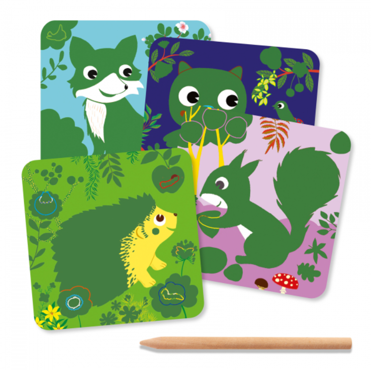 Children follow the instructions and use the wooden stick to scratch patterns into the surface of the cards and see what surprises are in store - it’s so much fun! Even if they get carried away and want to scratch everything off, the results will be just as pretty. Scratching and discovering surprises. Set includes: 4 scratch-off designs (20 x 20 cm), 1 wooden stylus with rounded tips and 1 step-by-step instructions booklet. An explanatory booklet in colour with pictures only. A large, child-friendly stylus with blunt tip. Material that is easy to scratch. Helps develop dexterity and imagination. Handy, easily-portable set.