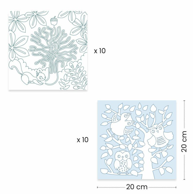Set includes: 1 box of 10 colouring sheets and 10 games (20 x 20 cm) to tear off. Made of FSC® certified paper and card.