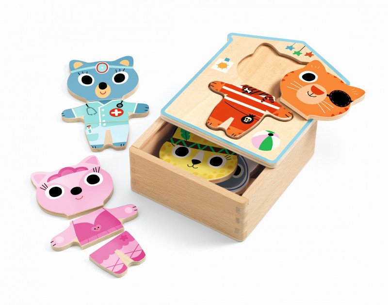 The Dressup-Mix puzzle contains 6 colourful characters, each consisting of 3 wooden pieces. On the lid of the box, children piece together the character of their choice: the ballerina, the doctor or the pirate, or plays with mixing up the pieces as their imagination leads them. Store everything away easily in the handy house-shaped pencil box. Develops motor skills and shape and colour recognition. The cut-out in the lid helps children to position the pieces correctly and lets them mix up the characters. The figures have identical shapes so that they can be mixed up together. The game holder doubles up as a storage box.