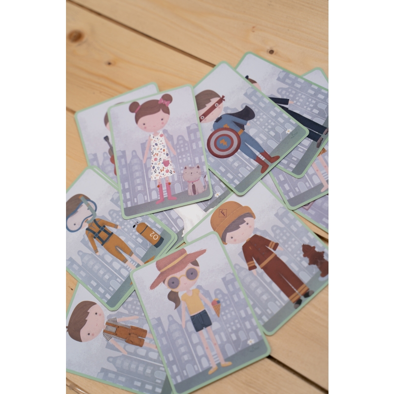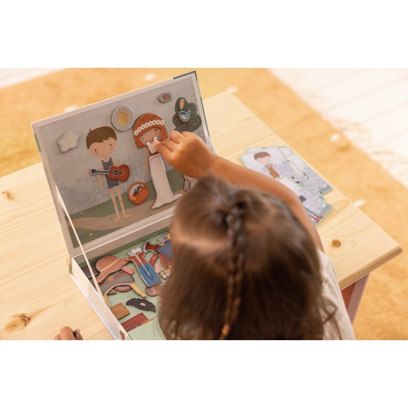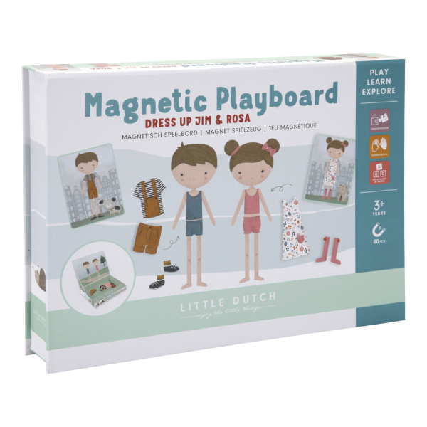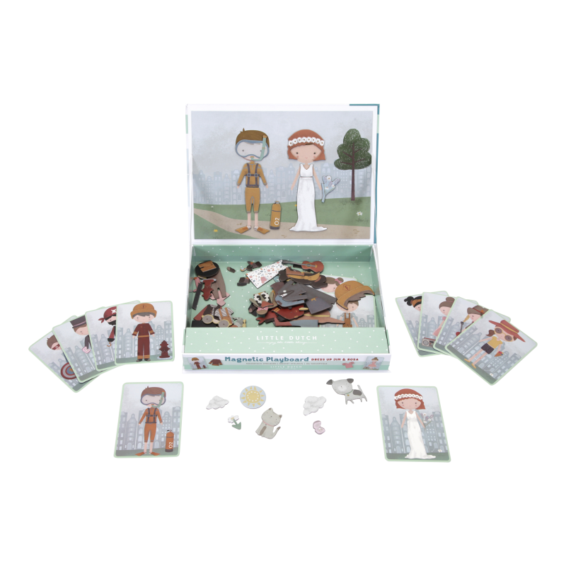 Play dress up with Jim & Rosa! With this magnetic puzzle you can copy the outfits of the cards on the board with magnetic pieces. Or use your own fantasy. There are endless combinations that guarantee lots of fun while encouraging vocabulary and coordination. At home, but also on the road.
