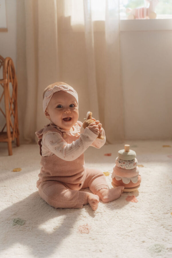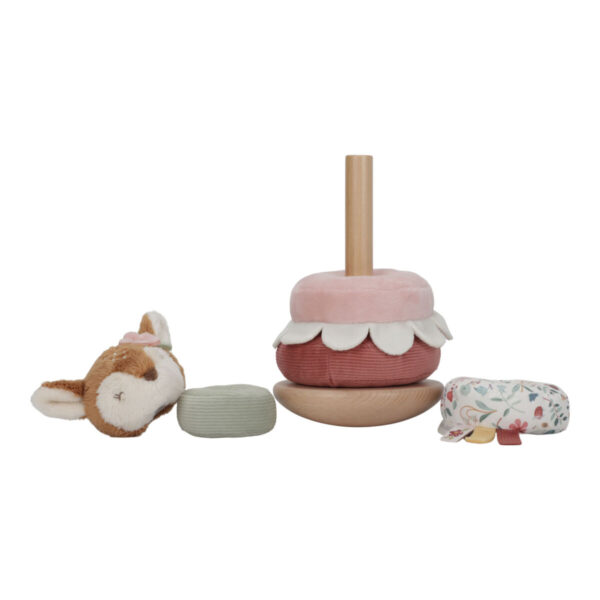 Stack the rings on the rocking base and let the deer dance and spin! It’s quite a challenge to stack the rings on a wooden base that rocks back and forth. However, the adorable deer encourages you to persist, and will celebrate with a little dance once the pyramid is completed. Each lovely ring features a unique design inspired by the Fairy Garden collection. This rocking ring stacker is designed to enhance hand-eye coordination through enjoyable, hands-on play. Let the stacking adventure begin!