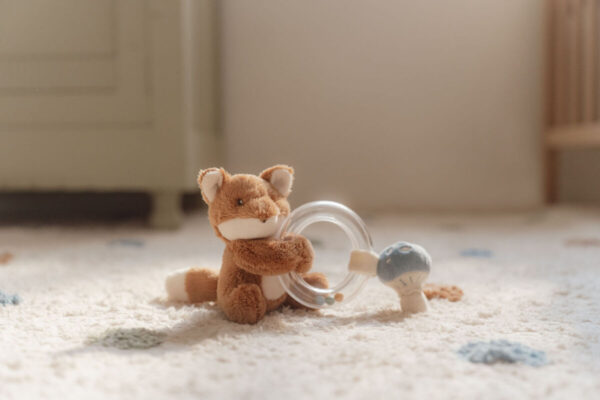 Grasp, turn and shake! The lovely deer with her soft fur, invites you to play and set this rattle ring in motion.