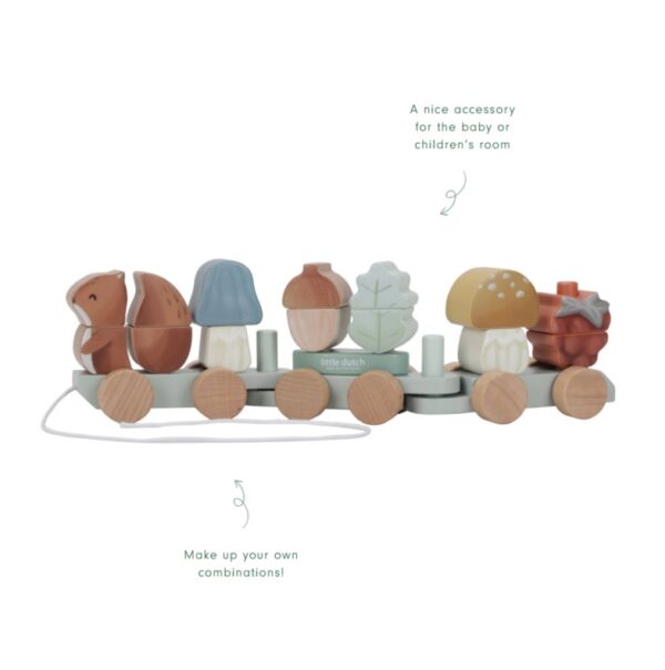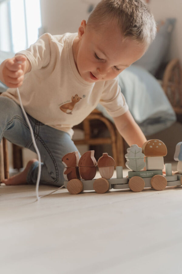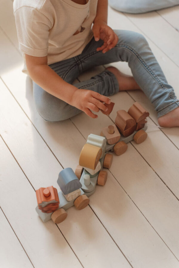 Stack all the blocks one by one to the three wagons of this wooden stacking train. The hedgehog will take the lead and sits at the front. Which flower will follow and where does the lady bug sit? Each block becomes a piece of the story of your imagination. A fun way to play and develop hand-eye coordination at the same time. The train includes 15 parts and is approximately 45 cm long.