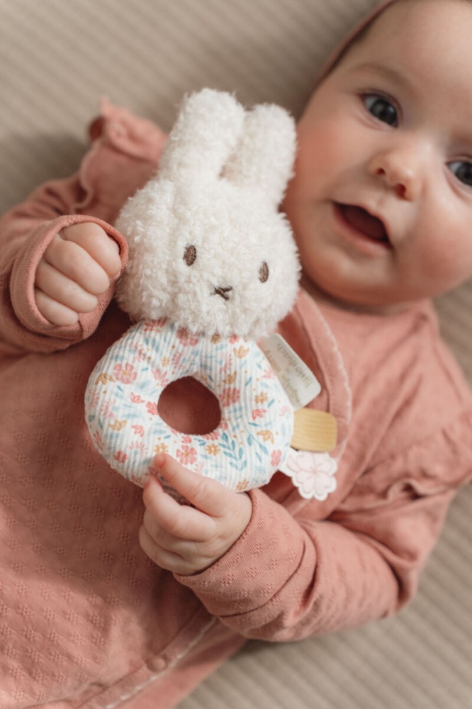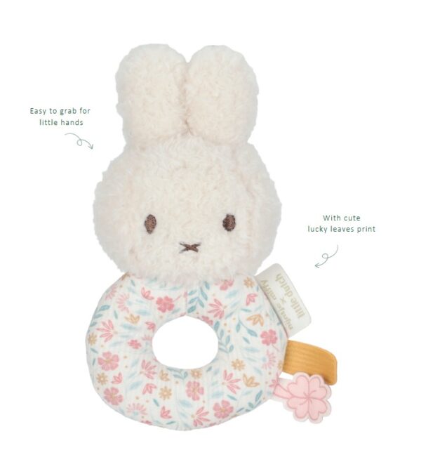 The ring shaped rattle is decorated with the Lucky Blossom of Little Dutch and is designed for easy grasp by little hands. There are 3 small labels to explore and a friendly Miffy on top to play with.