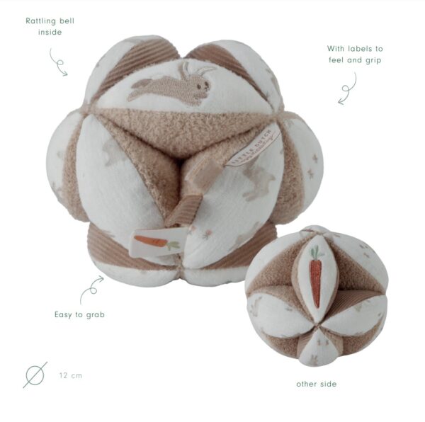 Reach and go for it! This gripping ball with its interesting shape makes for a great challenge for your little one. There are many spots to grab and explore with different textures and patterns. It’s easy to pick up for little hands and when it moves the joyful sound of the bell rattle will cheer your baby on. Easy-to-grab knots and various labels will stimulate the senses, develop grip and keep your baby engaged in the playpen.