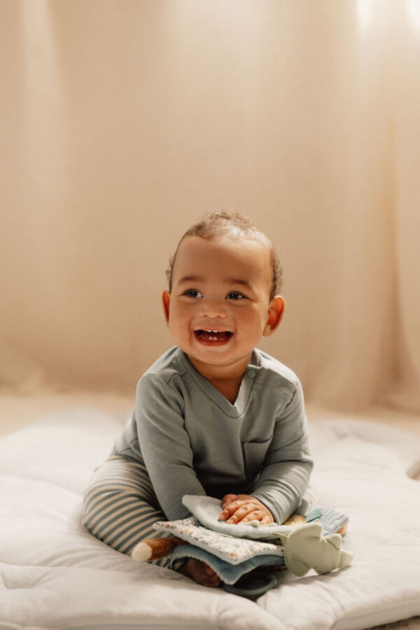 Featuring engaging labels, crinkle textures, and a mirror, this booklet is designed to captivate your child's senses page by page. Simply attach the loop to the stroller to keep it securely in place during your outings.